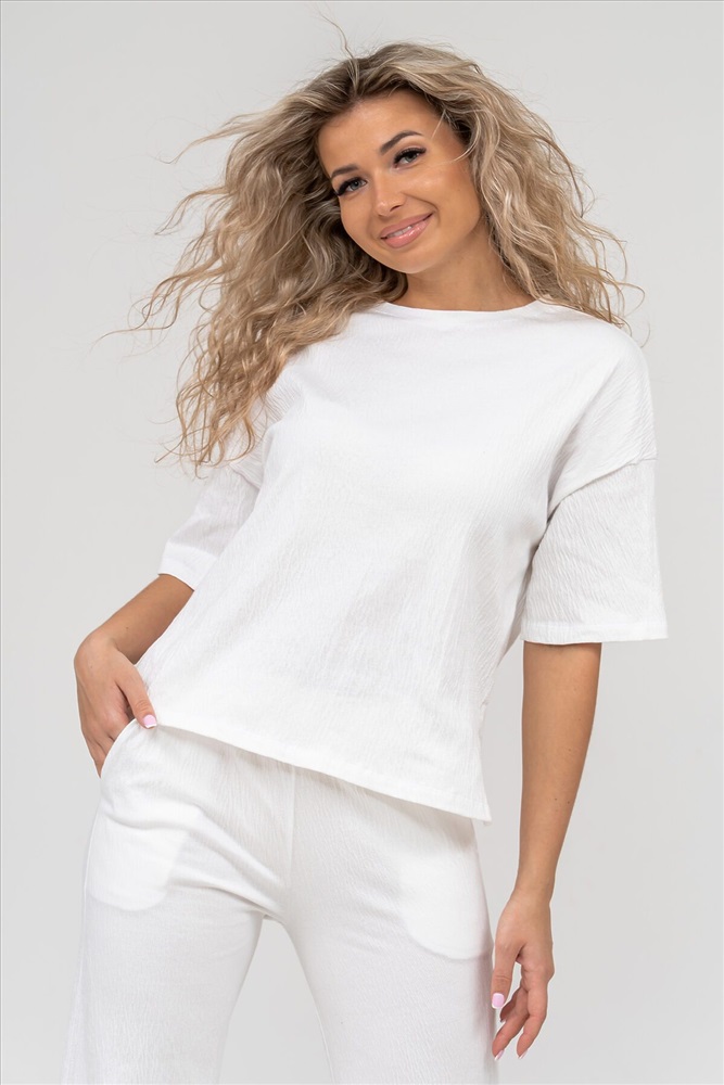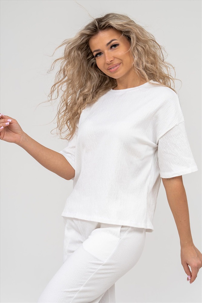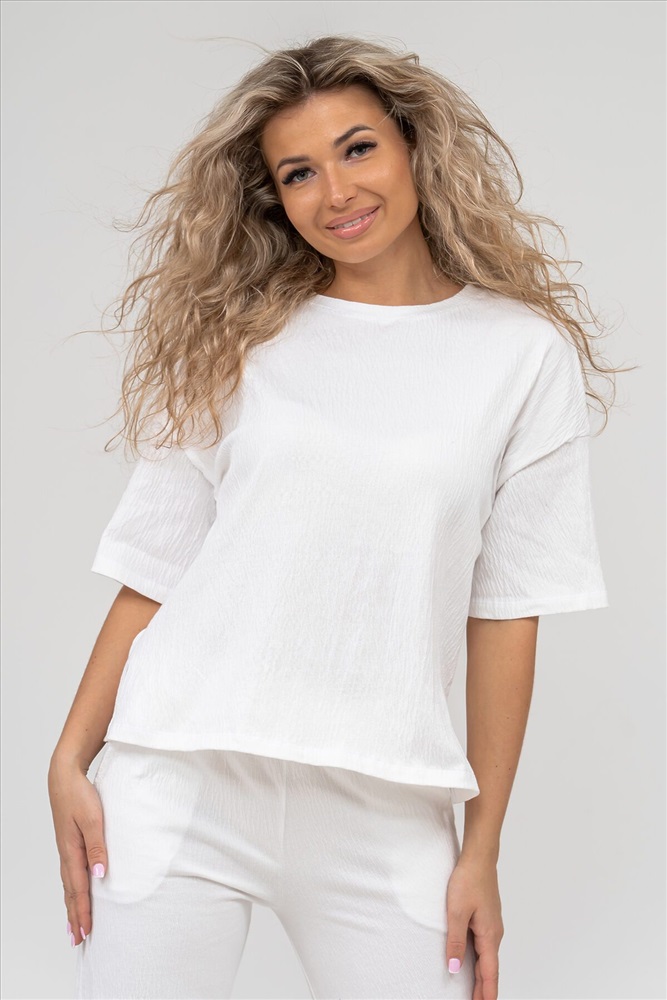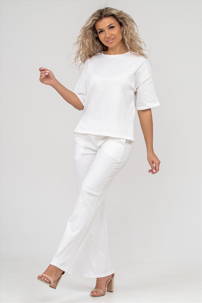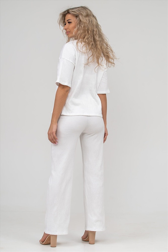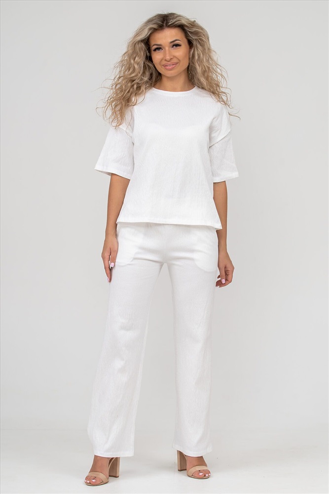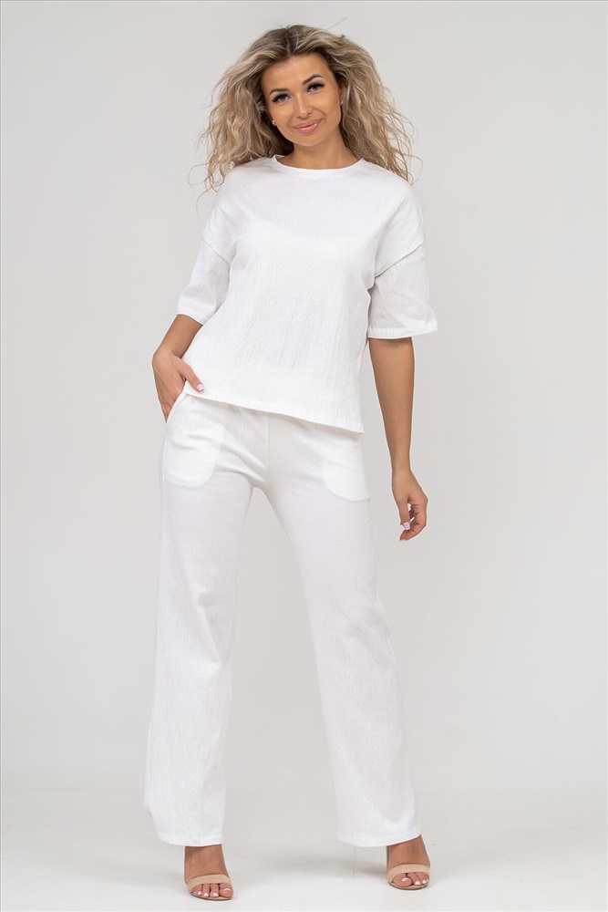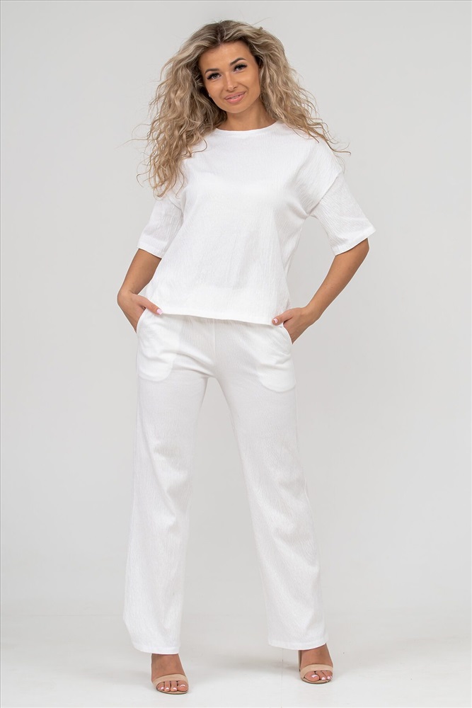 ID товара: 904142 Состав: 88% Хлопок; 10% Полиэстер; 2% Лайкра Сезон: Весна/Лето Длина: Средняя Фасон: Свободный крой Рукав: короткие Крой брючин: Прямой Тип карманов: В боковом шве Основная ткань: Хлопок Стиль: Повседневный Вид ткани: Жатка Страна бренда: Россия Страна производства: Россия Модный стильный костюм - идеальное решение для тех, кто ищет лёгкую и красивую одежду на каждый день. Костюм, футболка и брюки, выполнен из кулирки гипе жатка компакт. Жатка - это ткань с мятой структурой, декоративными заломами и складками. Имеет много положительных качеств: хорошо тянется, упругая, красивая текстура, неприхотливая в уходе, прочная, износостойкая, не мнётся, не нуждается в глажке и приятная к телу. Футболка выполнена со спущенным рукавом, отстроченной обтачкой по горловине и двумя небольшими разрезами по бокам. На брюках имеется два вместительных боковых кармана и пояс, обработанный на специализированной поясной машине. Данная модель костюма очень удобна в качестве повседневной одежды, а универсальный фасон хорошо скроет недостатки и подчеркнет достоинства фигуры. Свободный крой комплекта двойки не сковывает движения, что делает его очень удобным в носке, резинка не перекручивается, а высокая посадка брюк - палаццо даёт ощущение комфорта. Такой костюм можно использовать как в качестве костюма для фитнеса, так и как вариант домашнего костюма, в нем также можно поехать на дачу или отправиться на вечернюю прогулку. Однотонный дизайн летнего брючного костюма без принта, надписей и декоративных элементов будет гармонировать с любым стилем одежды, а дополнить образ с модным костюмчиком можно любимыми аксессуарами и украшениями. Свободную футболку и брючки можно носить как вместе, так и отдельно. Футболку с коротким рукавом и разрезами по бокам можно легко сочетать с джинсами, юбками и шортами. К брюкам с карманами можно также подобрать любой верх. Образ с костюмом можно дополнить кроссовками, кедами или туфлями. Мягкий, прочный, хлопковый материал не дает усадку, не теряет форму после стирки и не линяет, его можно стирать в режиме бережной стирки при 30 градусах. Также данный трикотажный костюм не скатывается и не вытягивается за счет небольшого количества полиэстера в составе. Такой однотонный костюм с широкими брюками подойдет для разной возрастной категории. Он идеально подойдет для беременных и мам с детьми. Хорошо сядет на высоких и невысоких представительницах прекрасного пола всех возрастов. Такой универсальный прогулочный женский костюм станет отличным подарочным вариантом, его можно подарить маме, дочери, жене, бабушке, подруге или порадовать себя любимую даже без повода. Наш костюм благодаря своей практичности и лаконичному дизайну будет служить Вам долгие годы. Ориентируясь по таблице замеров, обратите внимание, что замеры длины р Комментарии к товару