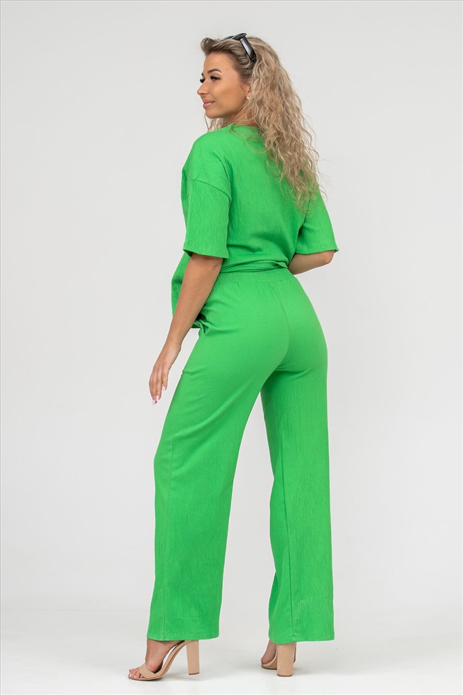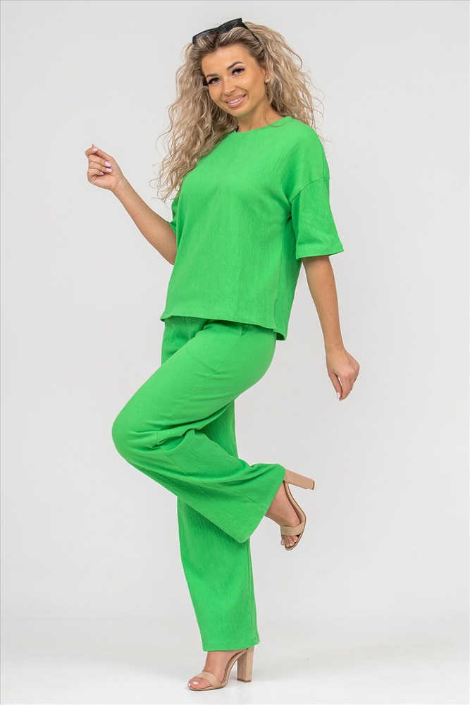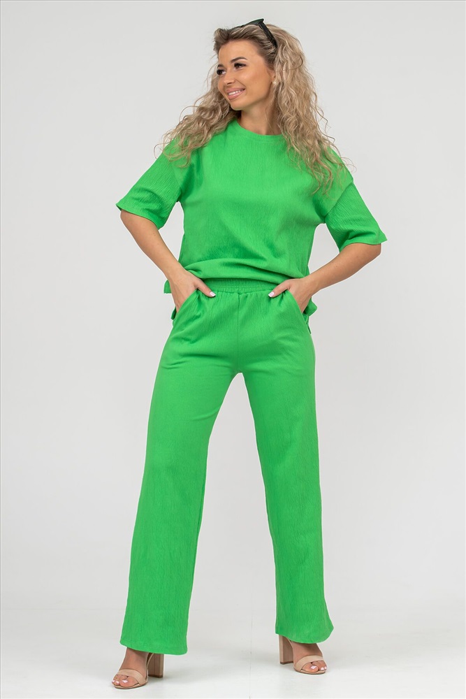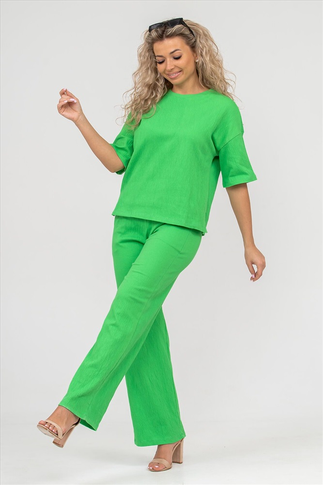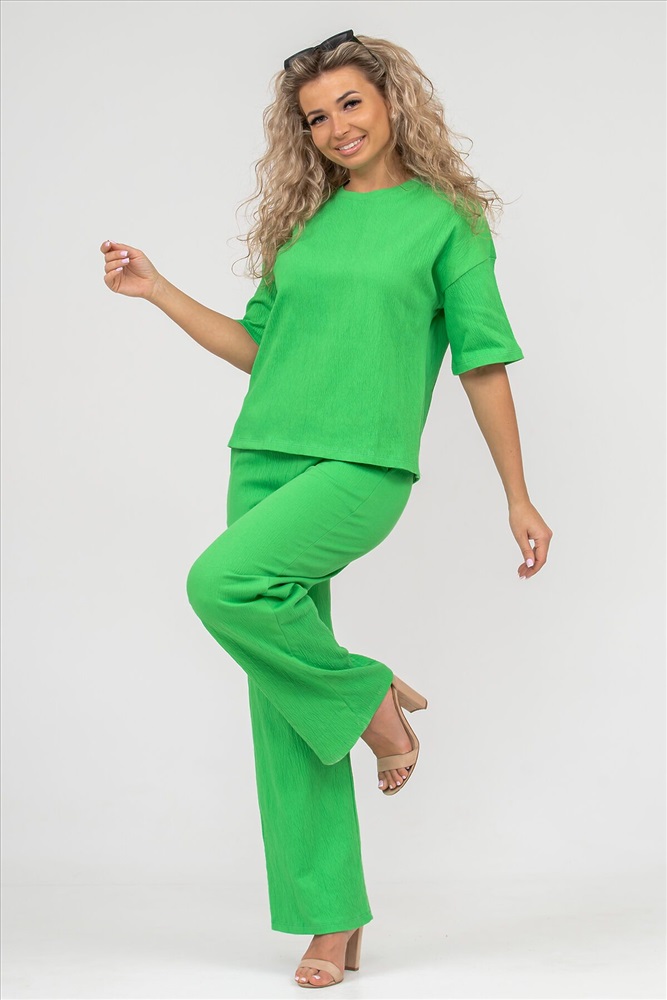 ID товара: 904143 Состав: 88% Хлопок; 10% Полиэстер; 2% Лайкра Сезон: Весна/Лето Длина: Средняя Фасон: Свободный крой Рукав: короткие Крой брючин: Прямой Тип карманов: В боковом шве Основная ткань: Хлопок Стиль: Повседневный Вид ткани: Жатка Страна бренда: Россия Страна производства: Россия Модный стильный костюм - идеальное решение для тех, кто ищет лёгкую и красивую одежду на каждый день. Костюм, футболка и брюки, выполнен из кулирки гипе жатка компакт. Жатка - это ткань с мятой структурой, декоративными заломами и складками. Имеет много положительных качеств: хорошо тянется, упругая, красивая текстура, неприхотливая в уходе, прочная, износостойкая, не мнётся, не нуждается в глажке и приятная к телу. Футболка выполнена со спущенным рукавом, отстроченной обтачкой по горловине и двумя небольшими разрезами по бокам. На брюках имеется два вместительных боковых кармана и пояс, обработанный на специализированной поясной машине. Данная модель костюма очень удобна в качестве повседневной одежды, а универсальный фасон хорошо скроет недостатки и подчеркнет достоинства фигуры. Свободный крой комплекта двойки не сковывает движения, что делает его очень удобным в носке, резинка не перекручивается, а высокая посадка брюк - палаццо даёт ощущение комфорта. Такой костюм можно использовать как в качестве костюма для фитнеса, так и как вариант домашнего костюма, в нем также можно поехать на дачу или отправиться на вечернюю прогулку. Однотонный дизайн летнего брючного костюма без принта, надписей и декоративных элементов будет гармонировать с любым стилем одежды, а дополнить образ с модным костюмчиком можно любимыми аксессуарами и украшениями. Свободную футболку и брючки можно носить как вместе, так и отдельно. Футболку с коротким рукавом и разрезами по бокам можно легко сочетать с джинсами, юбками и шортами. К брюкам с карманами можно также подобрать любой верх. Образ с костюмом можно дополнить кроссовками, кедами или туфлями. Мягкий, прочный, хлопковый материал не дает усадку, не теряет форму после стирки и не линяет, его можно стирать в режиме бережной стирки при 30 градусах. Также данный трикотажный костюм не скатывается и не вытягивается за счет небольшого количества полиэстера в составе. Такой однотонный костюм с широкими брюками подойдет для разной возрастной категории. Он идеально подойдет для беременных и мам с детьми. Хорошо сядет на высоких и невысоких представительницах прекрасного пола всех возрастов. Такой универсальный прогулочный женский костюм станет отличным подарочным вариантом, его можно подарить маме, дочери, жене, бабушке, подруге или порадовать себя любимую даже без повода. Наш костюм благодаря своей практичности и лаконичному дизайну будет служить Вам долгие годы. Ориентируясь по таблице замеров, обратите внимание, что замеры длины р Комментарии к товару