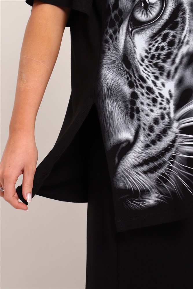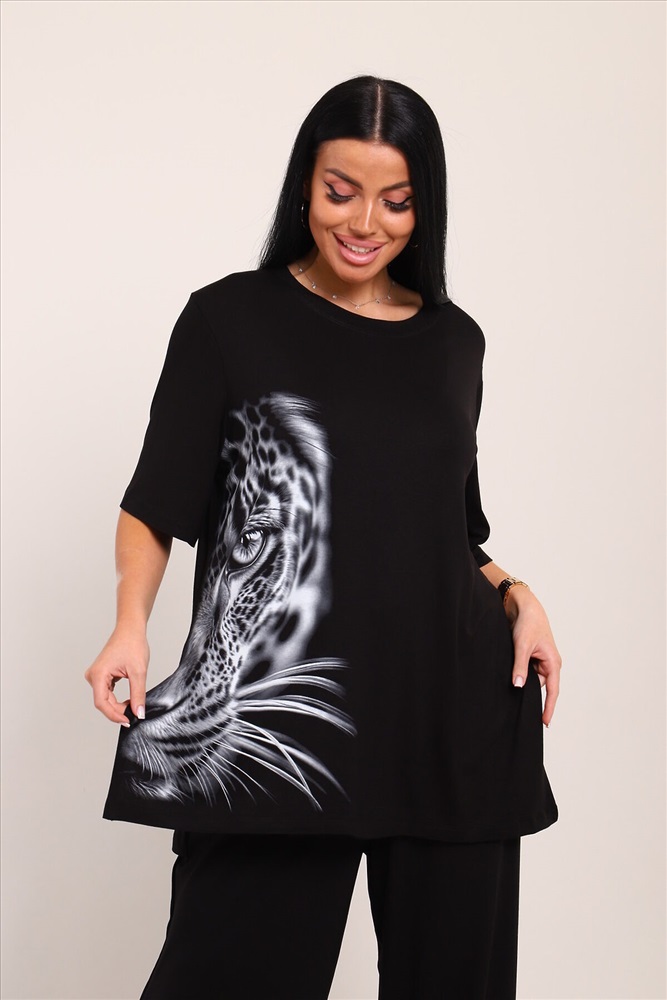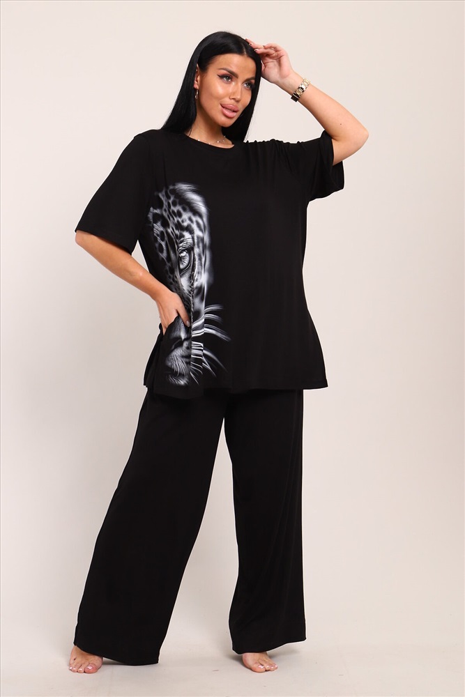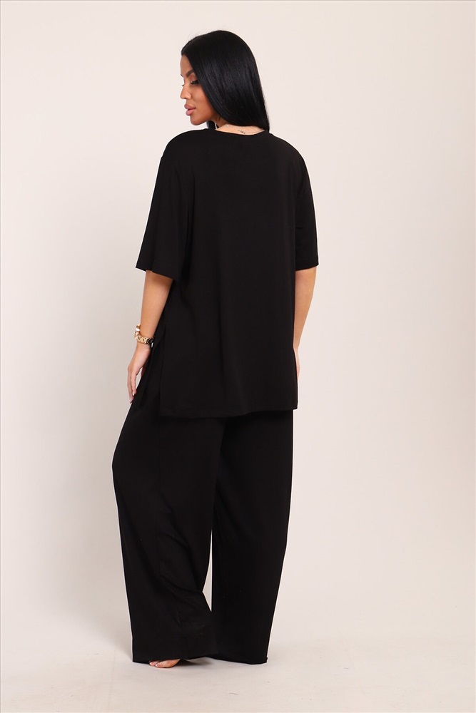 Трикотажный комплект из вискозы с удлиненной футболкой и боковыми разрезами по бокам и широкими брюками.