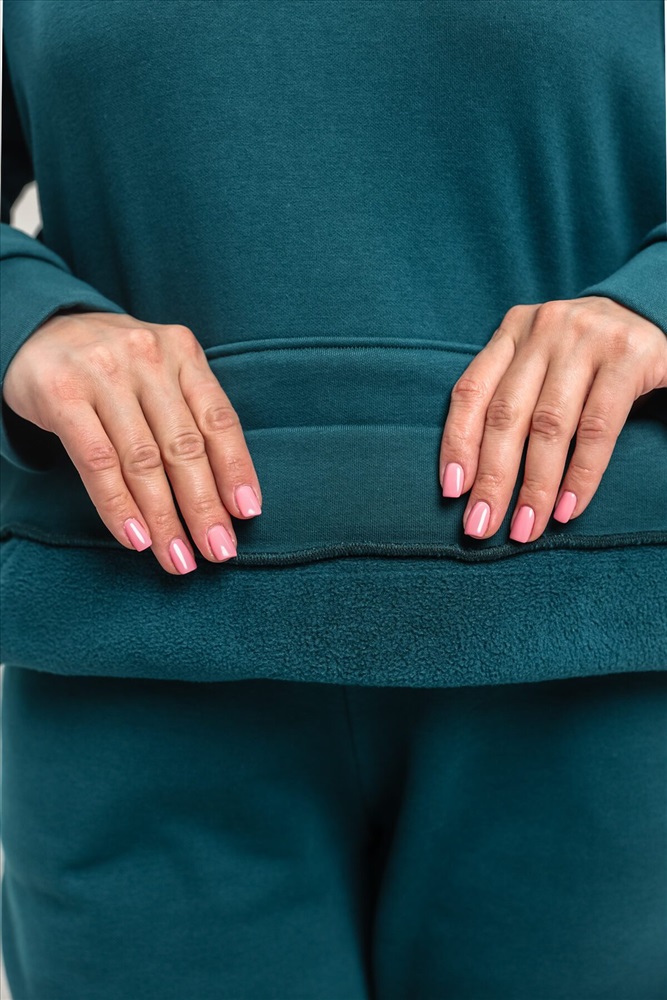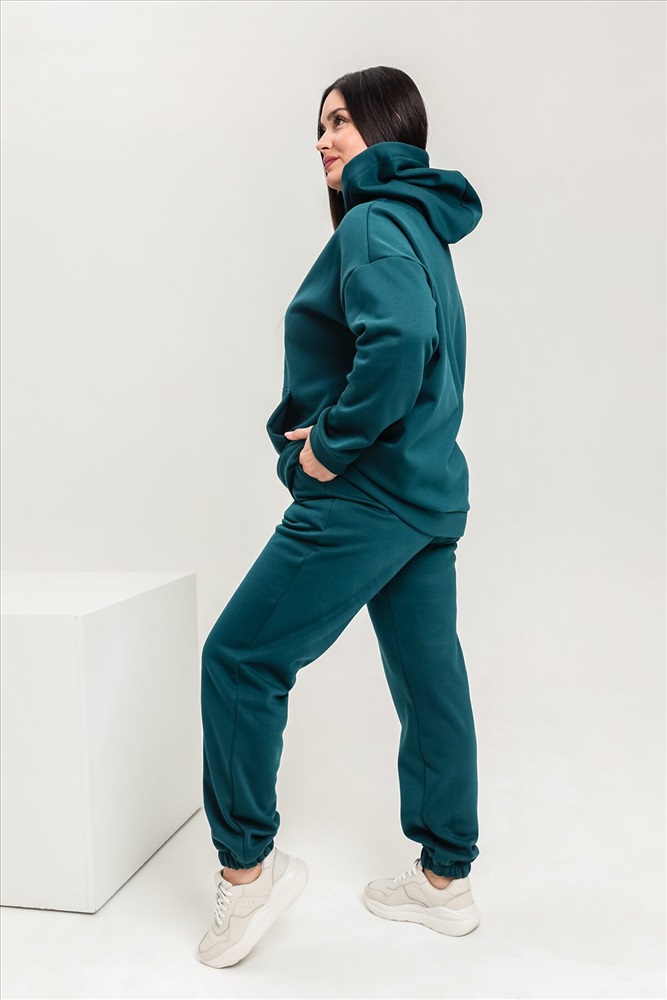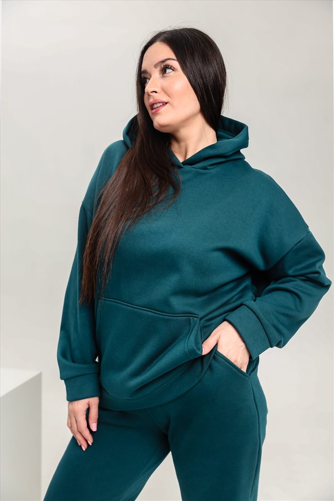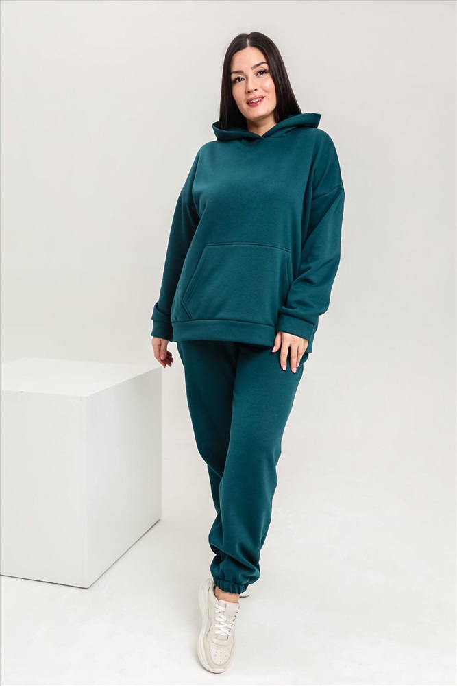 Костюм женский теплый из ткани интерсофт-начес. Толстовка костюма OVERSIZE с капюшоном и карманом кенгуру, брюки костюма с прорезными карманами и резинками внизу, резинка брюк прострочена на поясной пятиигольной машине. Идеальный вариант для холодной погоды.