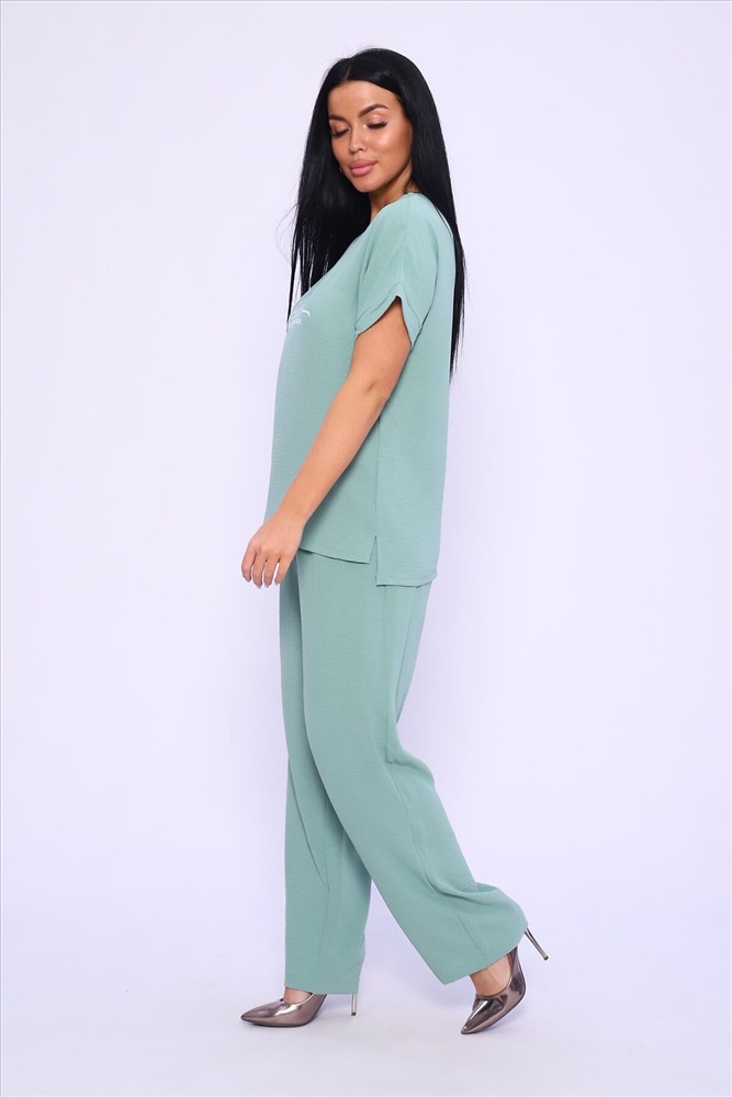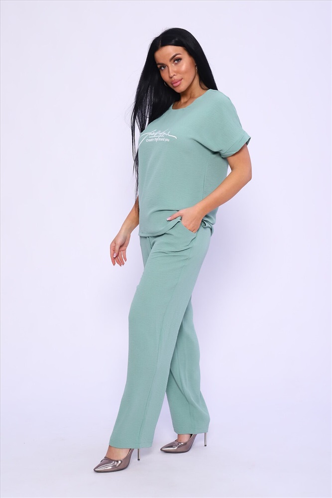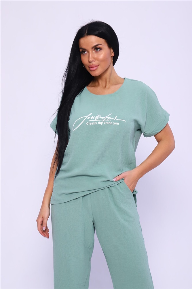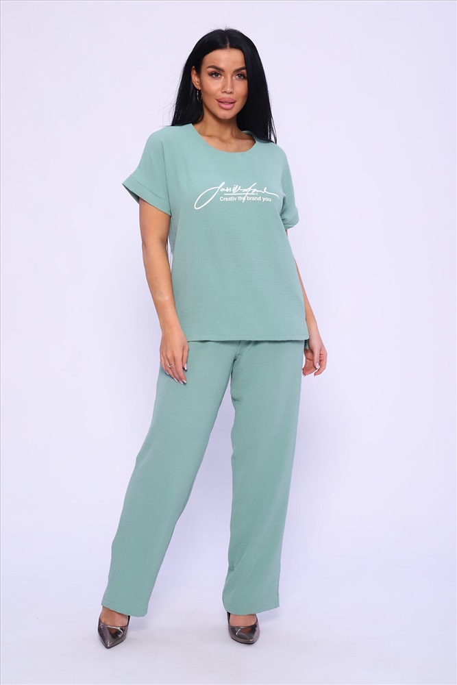 ID товара: 978196 Состав: 100% Полиэстер Сезон: Весна/Лето Длина: Полная Фасон: Прямой Рукав: короткие Крой брючин: Прямой Рисунок: Надпись Тип карманов: С отрезным бочком Декоративные элементы: Печатный принт Основная ткань: Полиэстер Стиль: повседневный Вид ткани: Сингапур Страна бренда: Россия Страна производства: Россия Женская двойка прямого кроя. Футболка костюма с коротким цельнокроеным рукавом, округлой горловиной и принтом на передней полочке, брюки с поясом на резинке (4 см) и карманами. Комплект достаточно свободный, поэтому подойдет для повседневной носки, как и для дома, так и на прогулку. Костюм представлен в двух приятных расцветках, выполнен из легкой ткани - сингапур, что идеально подойдет для жаркой погоды, красивый, но при этом простой и удобный. Комментарии к товару