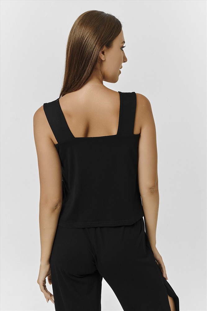 Костюм женский состоит из топа и джоггеров, в боковых швах разрезы.