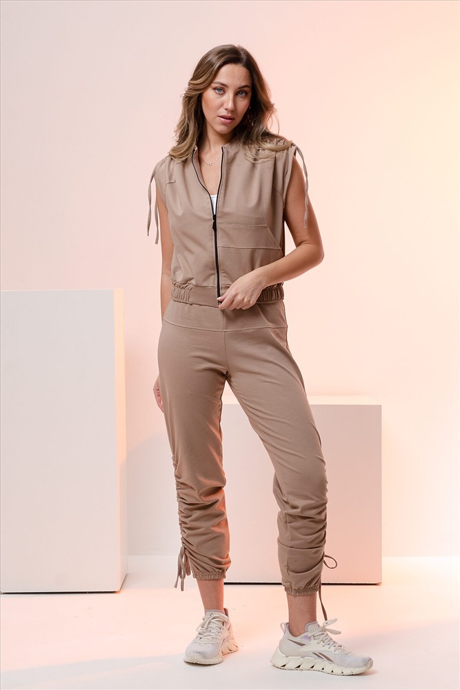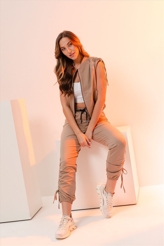 Стильный женский костюм с драпировкой. Однотонный вариант костюма двойка - неотъемлемая частью женского гардероба. Модель подойдет для прогулок и повседневной носки. Материал хорошо пропускает воздух. Крой жилета укороченный. Длину брюк и плеча можно регулировать при помощи завязок.