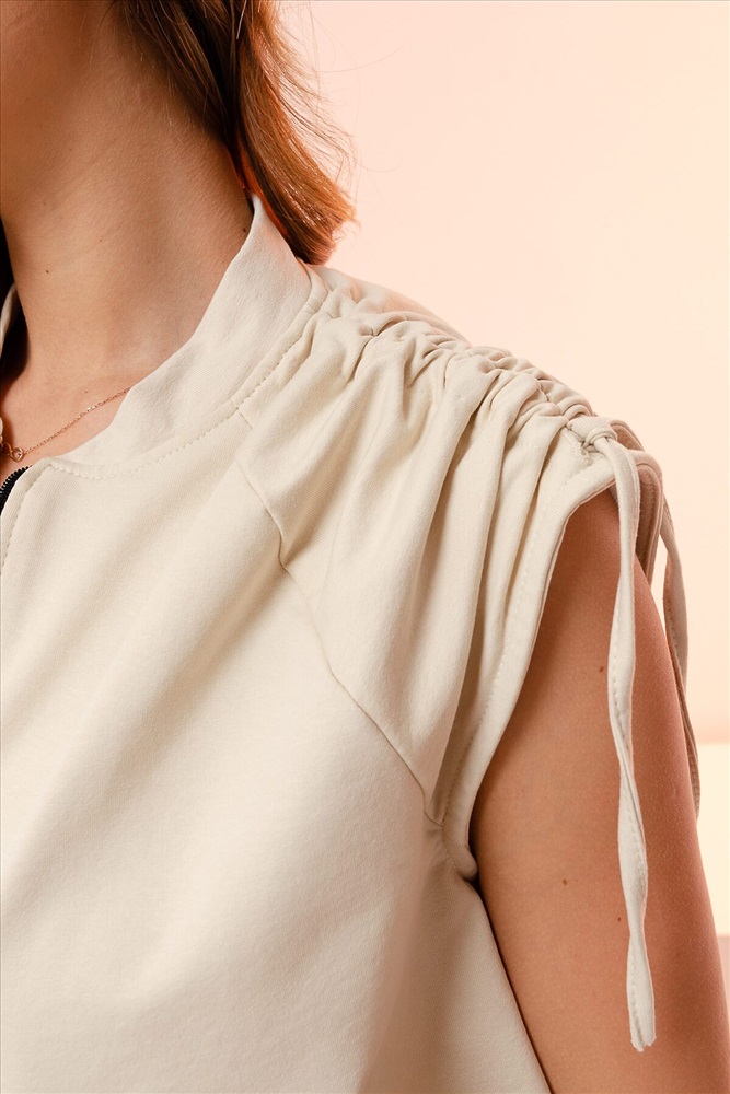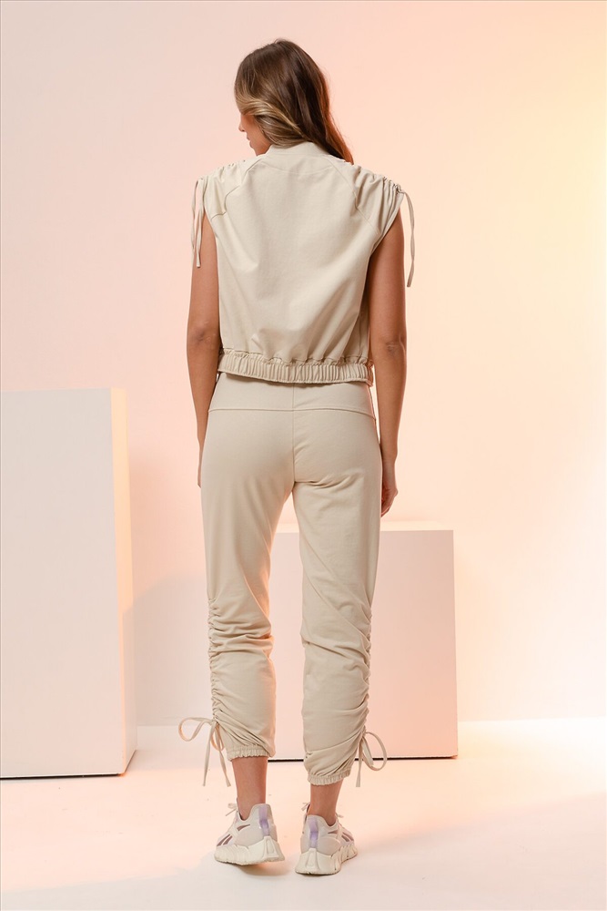 Стильный женский костюм с драпировкой. Однотонный вариант костюма двойка - неотъемлемая частью женского гардероба. Модель подойдет для прогулок и повседневной носки. Материал хорошо пропускает воздух. Крой жилета укороченный. Длину брюк и плеча можно регулировать при помощи завязок.