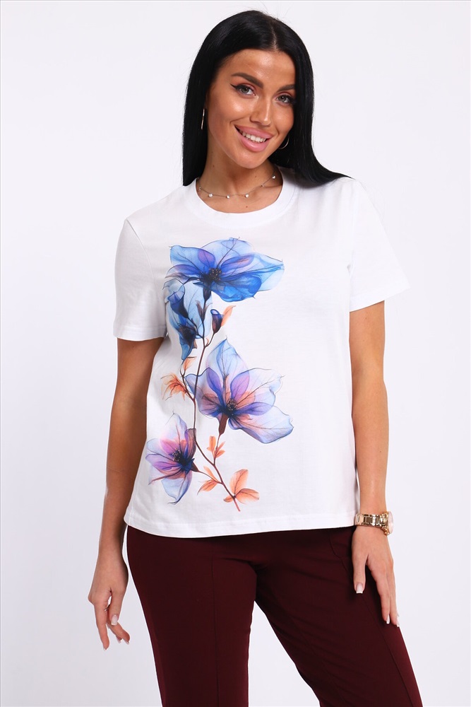 Представляем вашему вниманию современный костюм, состоящий из брюк и футболки. Брюки классические с отстроченной стрелкой спереди, двумя карманами, пояс на резинке. Футболка свободного кроя, с принтом. Костюм обладает отменными практическими характеристиками, и на долгое время сохранит свой первоначальный вид.