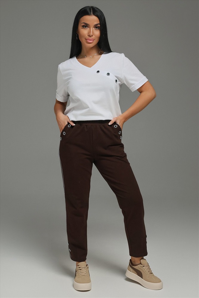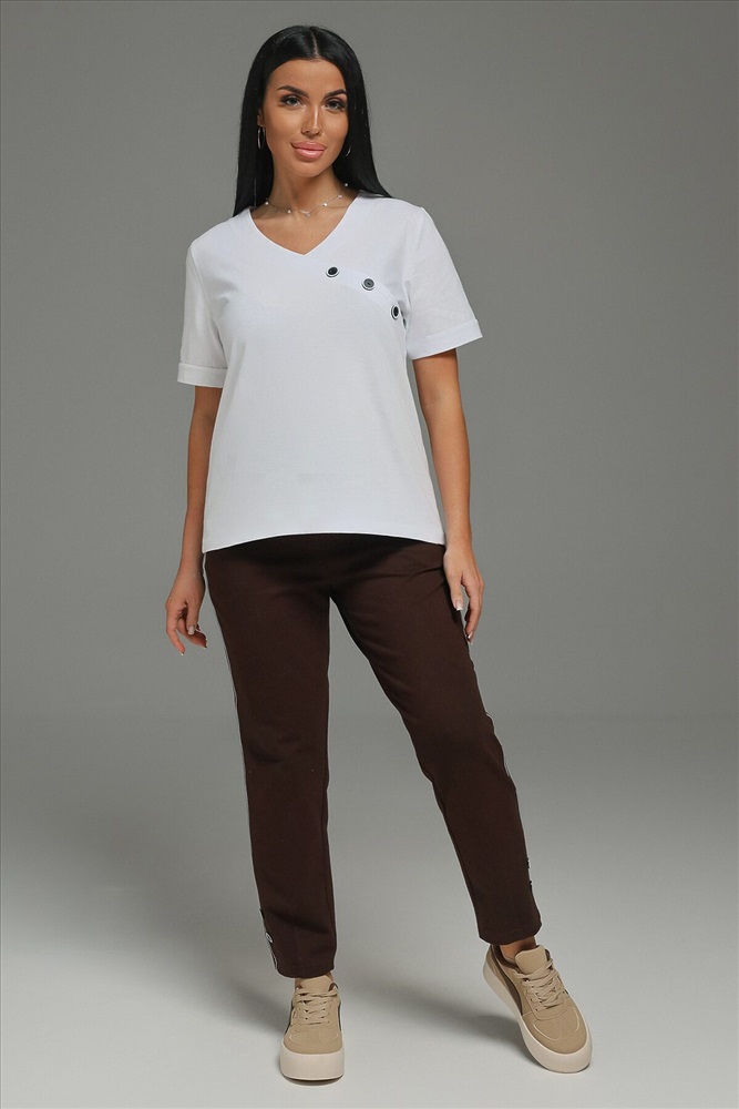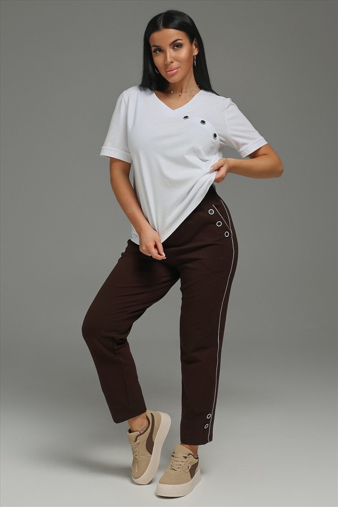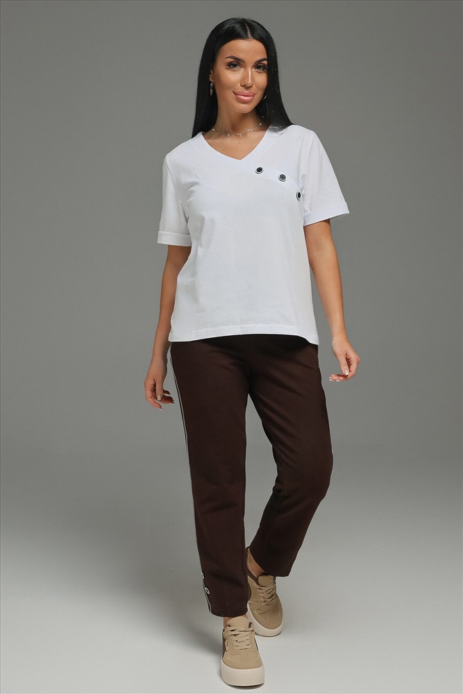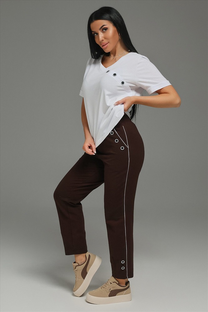 ID товара: 1098814 Состав: 74% Хлопок, 21% Полиэстер, 5% Лайкра; 100% Хлопок Сезон: Весна/Лето Длина: Полная Фасон: Прямой Рукав: короткие Крой брючин: Прямой Тип карманов: С отрезным бочком Декоративные элементы: Пуговицы Основная ткань: Хлопок Стиль: повседневный Вид ткани: Кулирка пенье, футер 2-х нитка Страна бренда: Россия Страна производства: Россия Брючный трикотажный костюм - это стильный и элегантный предмет гардероба, идеально подходит для дома и отдыха на любой период: весенний, осенний, летний и зимний. Костюм состоит из брюк и футболки, выполненный из высококачественного трикотажного материала. На карманах и по низу брюк декор дополнен декоративными пуговицами, как и на обтачке по фигурной планке. Изысканный комплект является идеальным выбором для всех, кто ценит качество и элегантность. Комментарии к товару