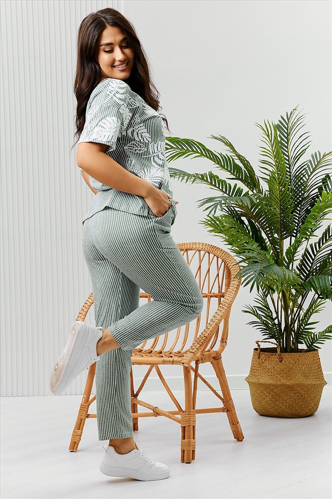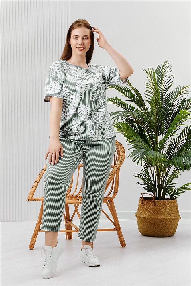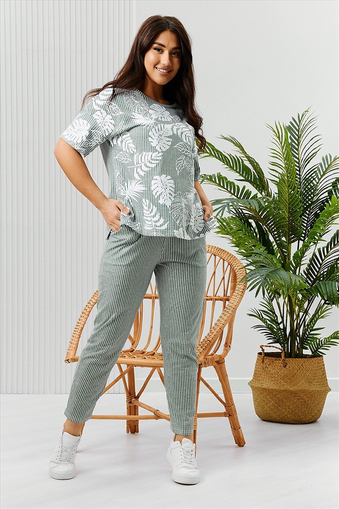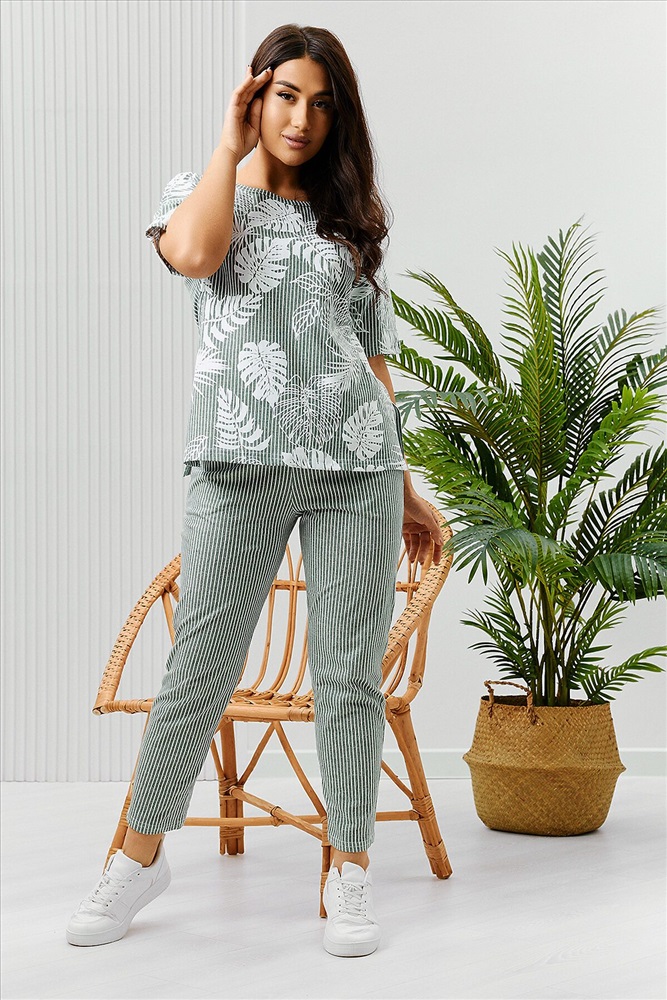 ID товара: 894480 Состав: Хлопок 100% Сезон: Весна/Лето Длина: Средняя Фасон: Полуприлегающий Рукав: Короткий Крой брючин: Зауженный Рисунок: растительный Основная ткань: Хлопок Стиль: Повседневный Вид ткани: Кулирка Страна бренда: Россия Страна производства: Россия Костюм состоит из туники и брюк. Туника прямого силуэта, с округлой горловиной, длиной до середины бедра. Спинка с кокеткой. В нижней части боковых швов обработаны разрезы. Рукав короткий. Горловина обработана бейкой из основного полотна. Брюки на поясе, с боковыми карманами. Комментарии к товару
