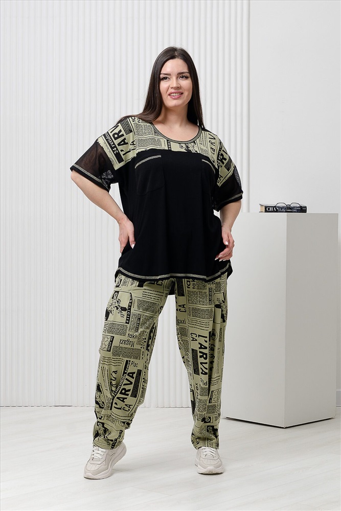 ID товара: 978769 Состав: 92% Хлопок, 8% Лайкра; 95% Хлопок, 5% Лайкра; 100% Хлопок Сезон: Весна/Лето Длина: Полная Фасон: Свободный Рукав: короткие Крой брючин: Прямой Рисунок: газетный Тип карманов: С отрезным бочком Декоративные элементы: Принт Основная ткань: Хлопок Стиль: повседневный Вид ткани: Кулирка с лайкрой, вискоза, сетка Страна бренда: Россия Страна производства: Россия Костюм женский. Туника и брюки. Туника состоит из трех частей: цельнокроеная кокетка полочки и спинки из хлопковой сетки, средняя часть из набивной кулирки, нижняя часть туники выполнена из дышащей вискозы. На полочке накладные нагрудные карманы из сетки. Брюки бананы. Передние и задние части брюк из трех частей. В верхней передней части брюк внутренние карманы. В средней части брюк по три вертикальные складки. Конструкция брюк позволяет скрыть любые недостатки в области бедер. Комментарии к товару