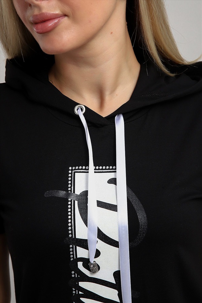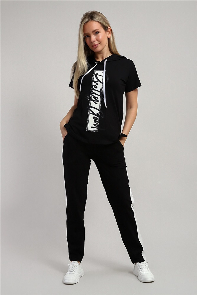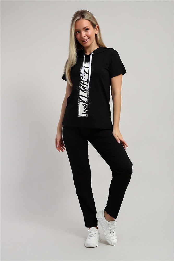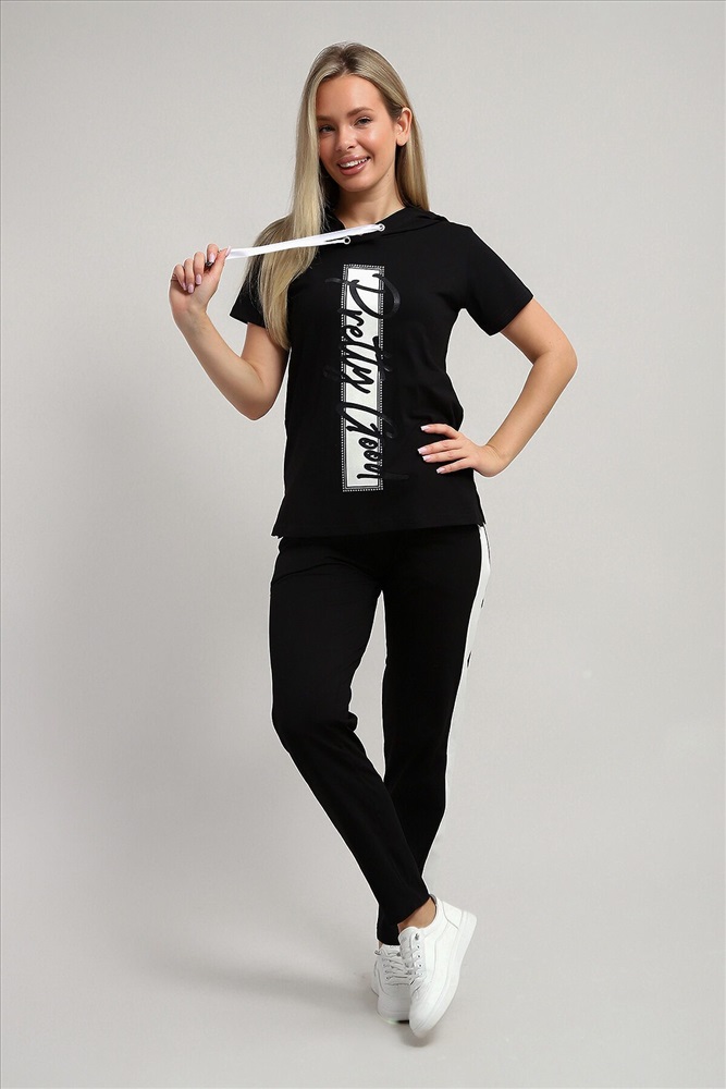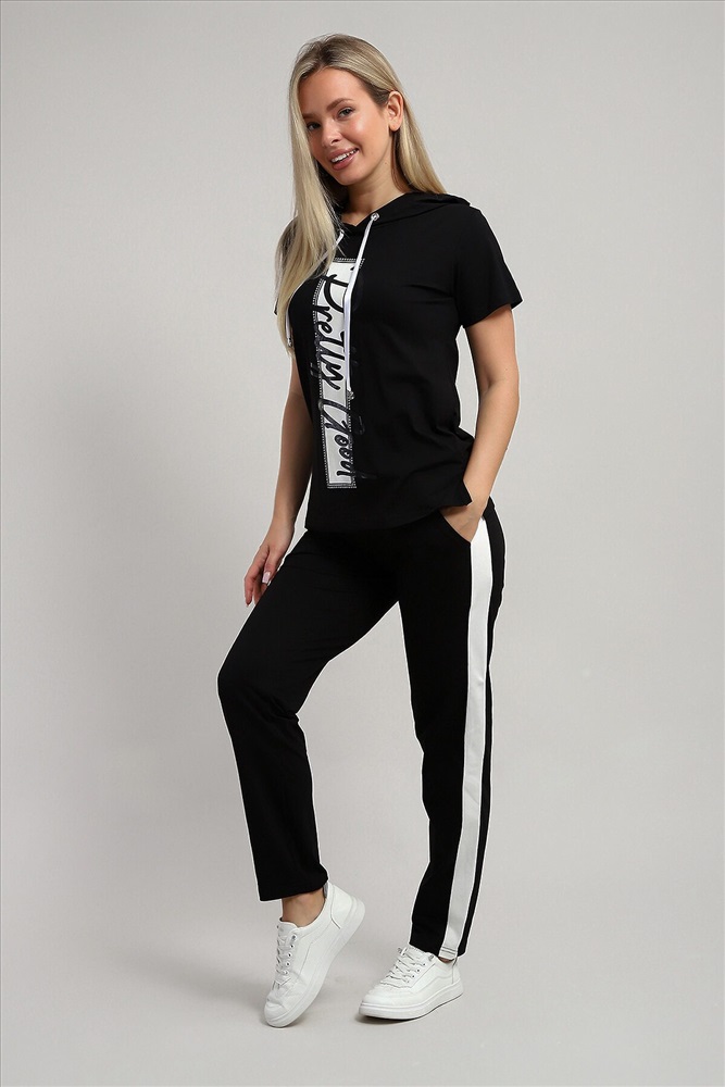 Стильный женский костюм из легкой дышащей ткани. Сшит из мягкого трикотажного полотна высокого качества. Основной изюминкой костюма является яркий принт на полочке кофты, расположенный вертикально и контрастирующий с общим фоном. Кроме того, на кофте имеется капюшон, объем которого регулируется тонкой лентой. Этот универсальный и практичный повседневный костюм в спортивном стиле будет удобным и комфортным во многих ситуациях. Комплект отлично подойдет для спорта, бега или танцев. Брюки свободные с яркими лампасами, двумя боковыми карманами, на широком поясе с резинкой. Каждую вещь вполне можно использовать по отдельности. Комплект отлично подойдет для женщин любого возраста и поможет хозяйке выглядеть стильно, при этом даря чувство комфорта!