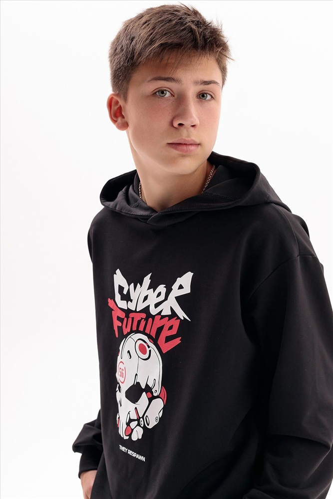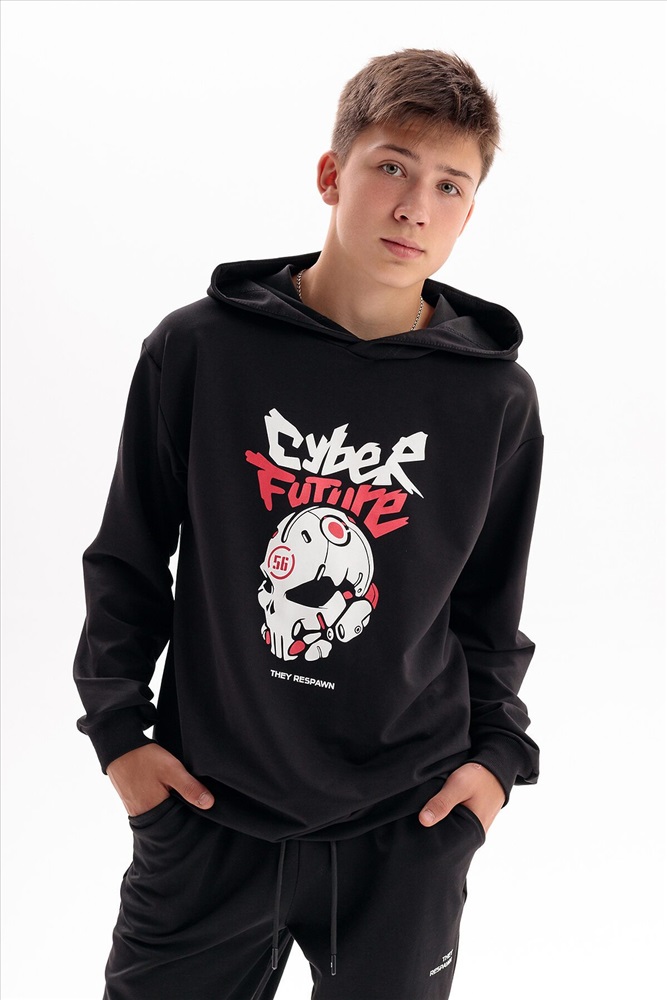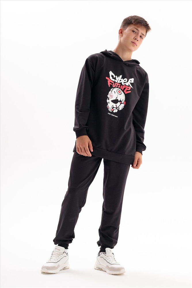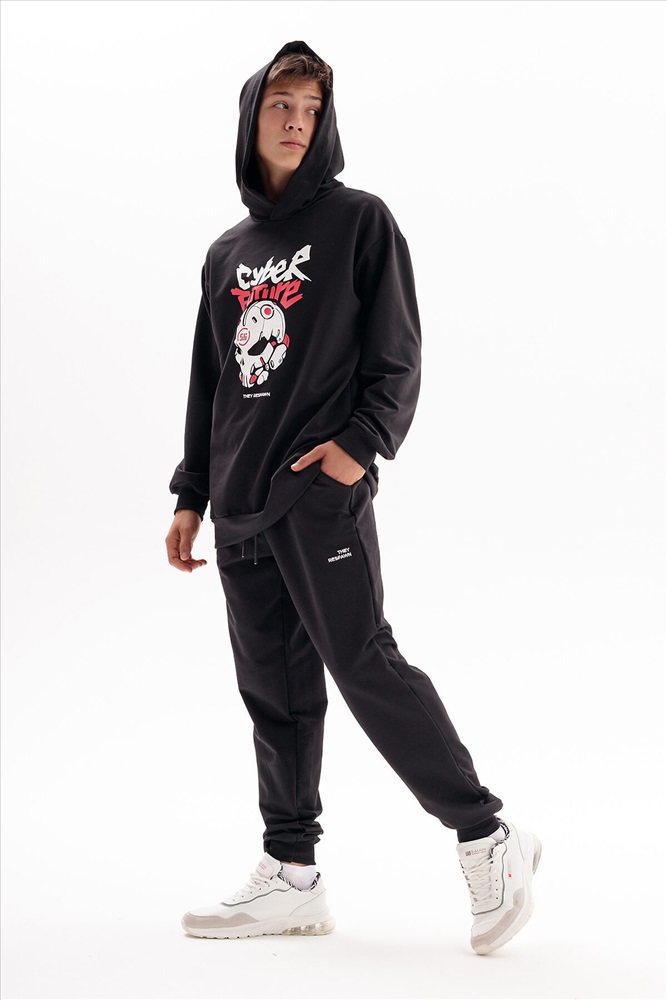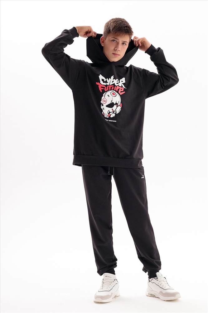 Спортивный костюм с брюками джоггерами для вашего подростка. Откройте новые горизонты комфорта и стиля для вашего ребенка с оригинальным спортивным костюмом, состоящим из удлиненной толстовки с глубоким капюшоном и джоггеров. Этот костюм, выполненный в оверсайз стиле, станет идеальным дополнением к гардеробу любого мальчика или подростка, ценящего удобство и модные тенденции. Изготовленный из дышащего материала на основе хлопка 75%, костюм обеспечивает комфорт в теплую осень и лето, будь то активные занятия спортом, игра в баскетбол, катание на велике, скейте или самокате. Модный спортивный костюм для мальчиков является отличным вариантом школьной формы для физкультуры. Этот костюм идеально подойдет для повседневного использования, включая прогулки с друзьями, в поход, вещи в лагерь или отпуск на море. Черный цвет добавляет универсальности, позволяя сочетать костюм с различными элементами гардероба для создания уникальных луков на каждый день. Оверсайз толстовка худи и штаны с идеальной посадкой не сковывают движения, делая костюм удобным для активного отдыха и спорта. Принт на толстовке добавляет образу оригинальности и подчеркивает индивидуальность, делая вашего мальчика заметным на фоне сверстников. Этот комплект станет незаменимым выбором для тех, кто ищет сочетание комфорта, стиля и универсальности в одежде для подростков. Таким образом, выбирая наш детский спортивный костюм, вы обеспечиваете вашего мальчика или подростка идеальным решением для каждого дня будь то для занятий спортом, прогулок или повседневного ношения.