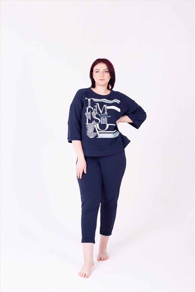 ID товара: 1214343 Состав: Хлопок 75%; Полиэстер 20%; Лайкра 5% Сезон: Демисезон Длина: Полная Фасон: Свободный Рукав: 3/4 Крой брючин: Зауженный Рисунок: Надпись Декоративные элементы: Принт Основная ткань: Хлопок Стиль: повседневный Вид ткани: Футер 2-х нитка Страна бренда: Россия Страна производства: Россия Костюм женский с брюками на резинке и свободной кофтой с рукавами 3/4. Модель выполнена из качественного футера 2-х нитки. Комментарии к товару