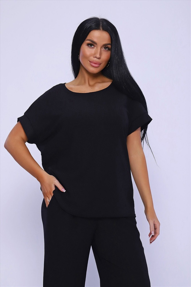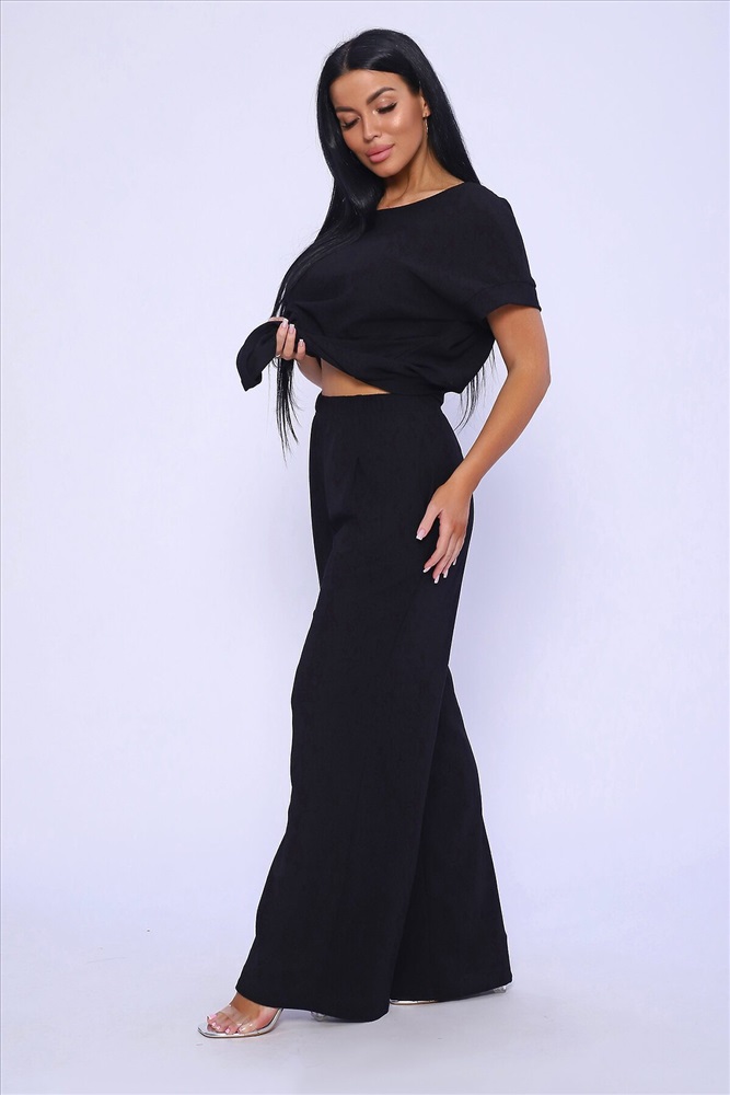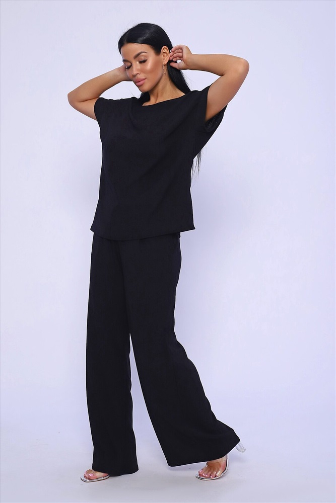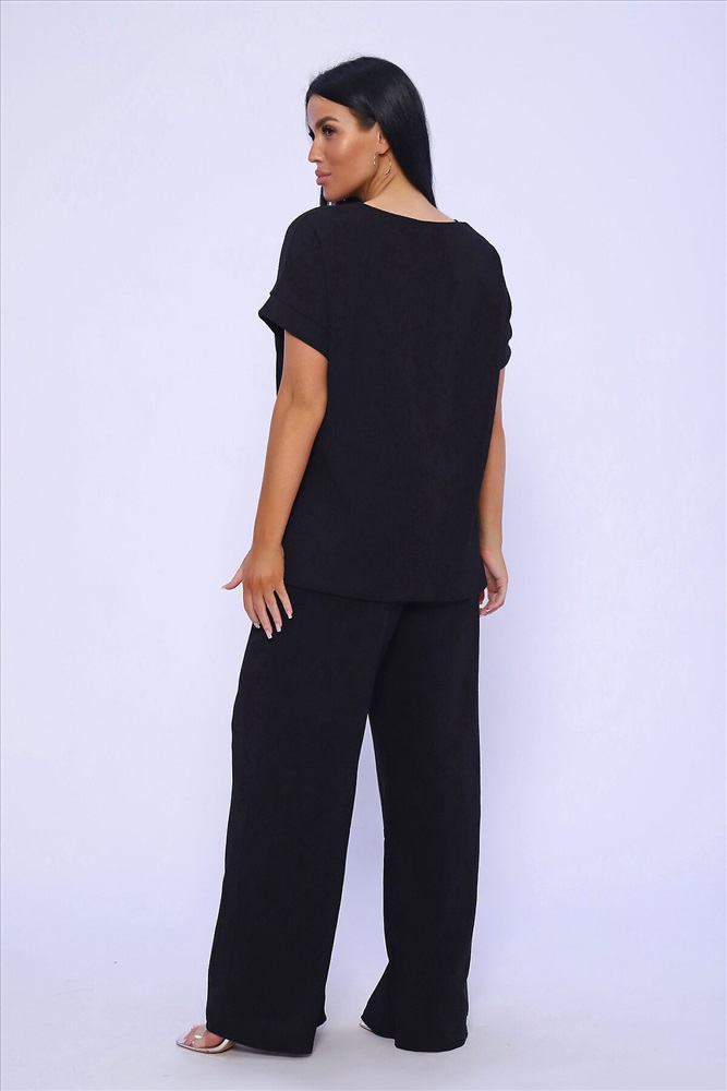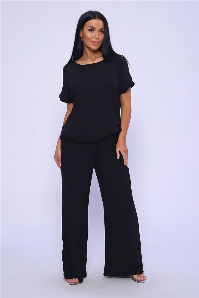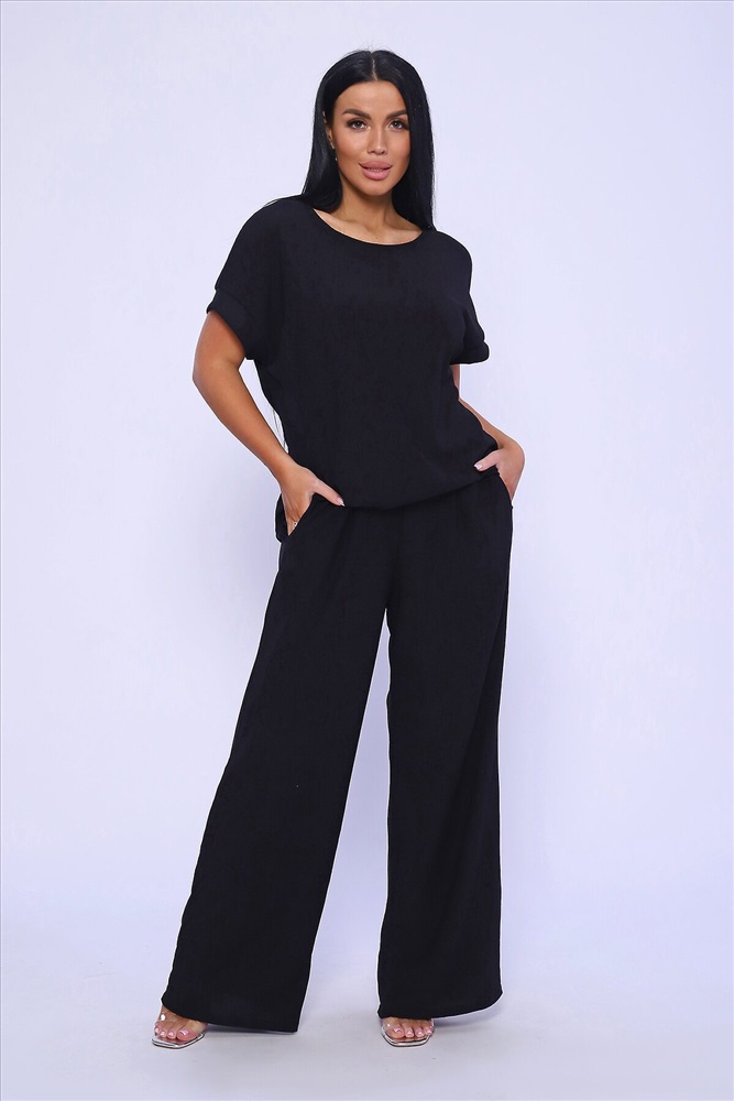 Брюки палаццо и футболка со спущенной проймой и с круглым вырезом горловины из тонкого, струящего материала - жатка. Такой красивый модный костюм не оставит равнодушной ни одну модницу. Вещи представлены стандартных и больших размеров для дам с пышными формами. Расклешенные брючки с завышенной талией на резинке с карманами отличаются удобным кроем, они стандартной длины и превосходно садятся по фигуре женщин, визуально удлиняют ноги и придают силуэту идеальные очертания. Благодаря наличию нагрудных вытачек футболка идеально садиться по фигуре.