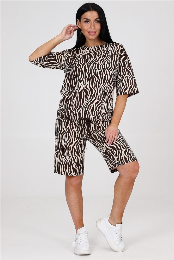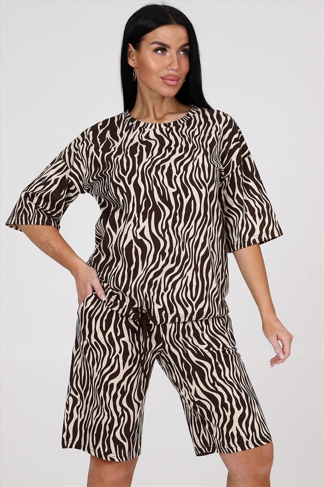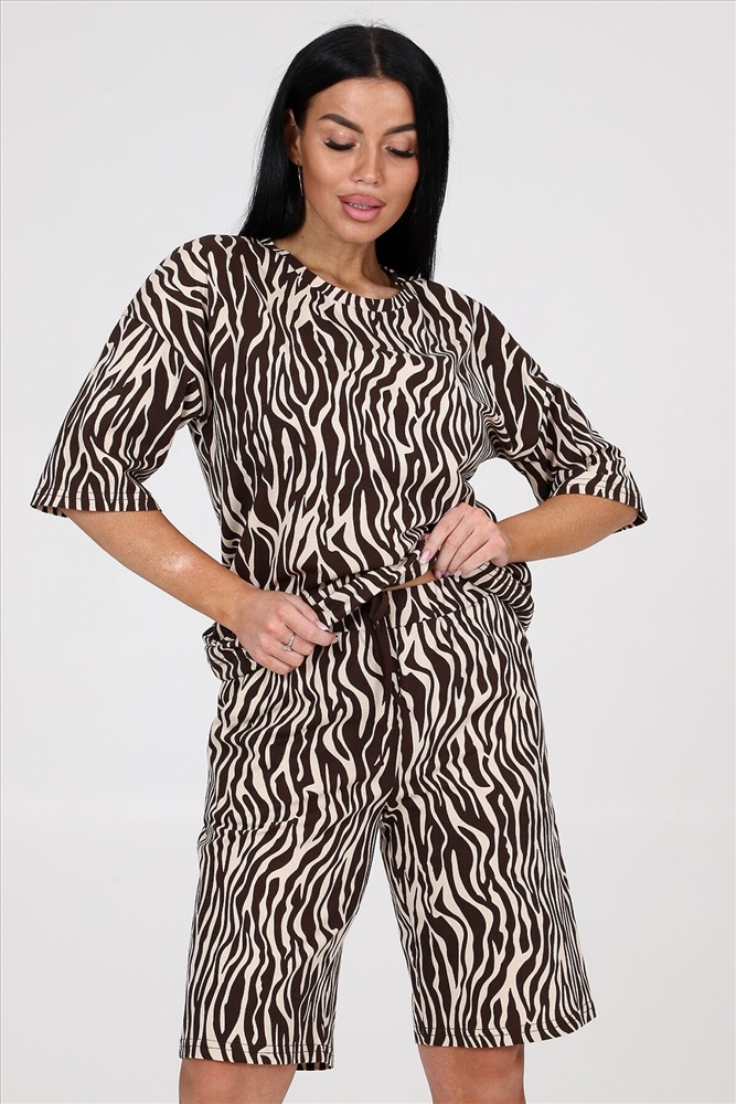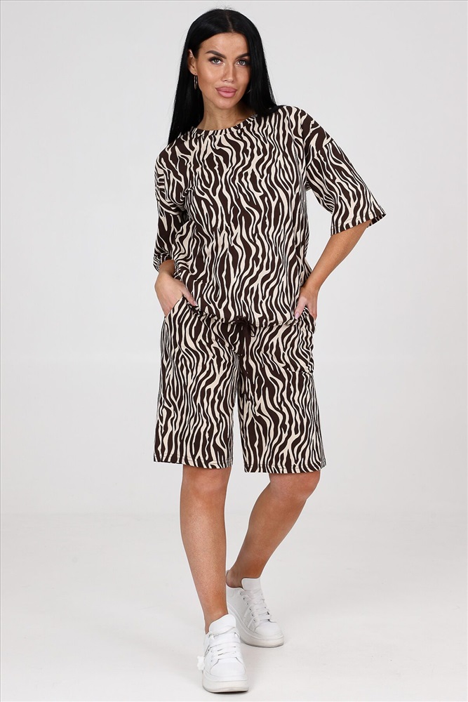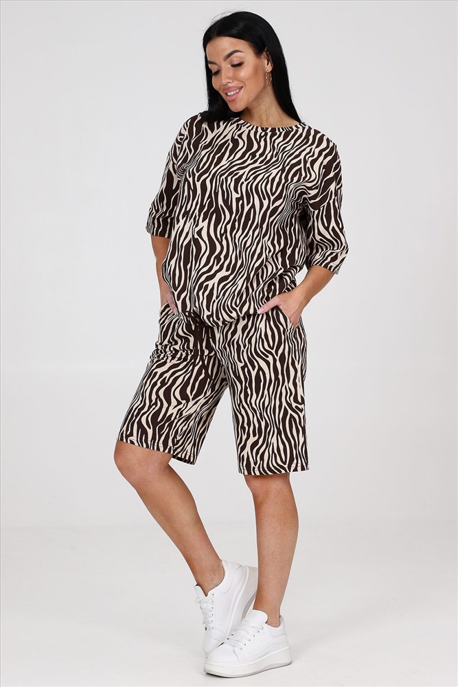 ID товара: 986358 Состав: Хлопок 100% Сезон: Весна/Лето Длина: Средняя Фасон: Прямой Рукав: короткие Крой брючин: Прямой Рисунок: Анималистичный Декоративные элементы: Принт Основная ткань: Хлопок Стиль: повседневный Вид ткани: Кулирка Страна бренда: Россия Страна производства: Россия Костюм женский из кулирки. Костюм состоит из блузы и шорт. Блуза свободного покроя, рукав втачной, по низу изделия кулиса. Шорты на притачном поясе с карманами. Комментарии к товару