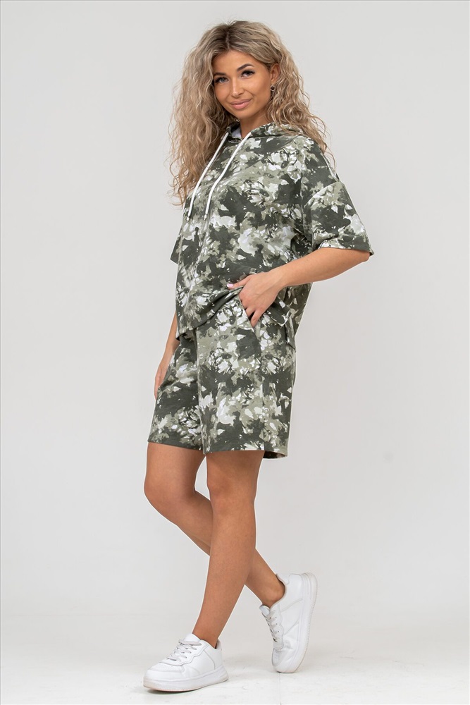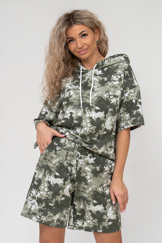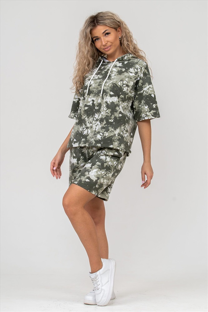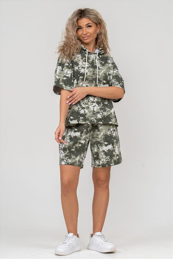 ID товара: 898979 Состав: 72% Хлопок, 20% Полиэстер, 8% Лайкра Сезон: Весна/Лето Длина: Средняя Фасон: Спортивный Рукав: короткие Рисунок: разводы Тип карманов: есть Основная ткань: Хлопок Стиль: Повседневный Вид ткани: Футер 2-х нитка Страна бренда: Россия Страна производства: Россия Женский костюм 2-ка выполнен из футера высокого качества с хлопком и небольшим добавлением полиэстера и лайкры, что позволяет изделию не скатываться и оставлять идеальный внешний вид на долгое время. Костюм состоит из толстовки и шорт. Толстовка с капюшоном и шнурком. Линия плеча спущена, рукав укороченный, по бокам имеются небольшие разрезы. Свободный крой прекрасно будет смотреться на дамах с любыми формами. Костюм такого плана представлен в широкой размерной сетке, что позволяет выбрать его как девушке, так и женщине. Однотонный костюм модных расцветок будет удачным выбором для поездок в отпуск, на пикник, для активного отдыха и прогулок по городу. Будет гармонично сочетаться как с кроссовками, так и с туфлями, балетками или босоножками. Используя эту модель в качестве домашнего костюма, Вы поймёте, что это именно тот самый идеальный вариант, в котором вы будете себя чувствовать удобно, комфортно и современно. Костюм с шортами - это настоящая находка для тех, кто ценит свою индивидуальность! Ориентируясь по таблице замеров, обратите внимание, что замеры длины рукава проводились от точки основания шеи. Комментарии к товару