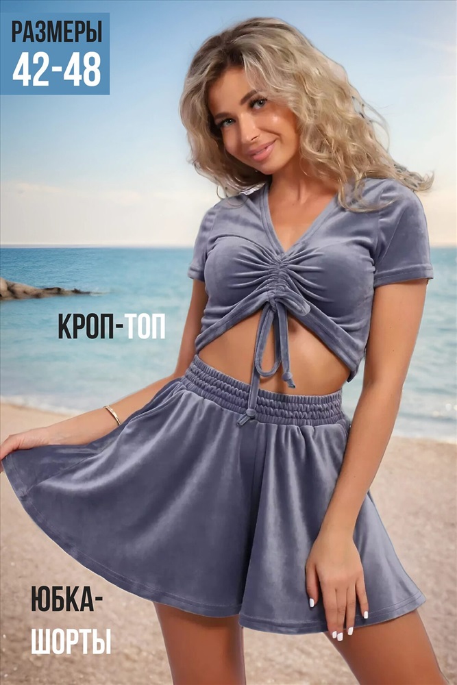 ID товара: 1020169 Состав: 92% Полиэстер, 8% Лайкра Сезон: Весна/Лето Длина: Средняя Фасон: Полуприлегающий Рукав: короткие Крой брючин: Широкий Декоративные элементы: Сборка Основная ткань: Полиэстер Стиль: повседневный Вид ткани: Велюр Страна бренда: Россия Страна производства: Россия Костюм выполнен из мягкого велюра. Нежный материал придает изделию благородный лоск, а сборка на завязках на груди топа и складки на юбке-шортах образуют роскошные переливы. Облегающий крой топа подчеркнет изгибы вашей фигуры, а укороченная длина акцентирует изящную талию. Юбка-шорты позволяет чувствовать себя уверенно и комфортно, не сковывает движения. Имеет глубокие карманы, позволяющие взять с собой всё необходимое. Юбка-шорты на резинке оригинального фасона, сочетается с любым верхом. Костюм подходит для любых мероприятий, от прогулки по городу, на природе, до танцев и спорта. Комментарии к товару