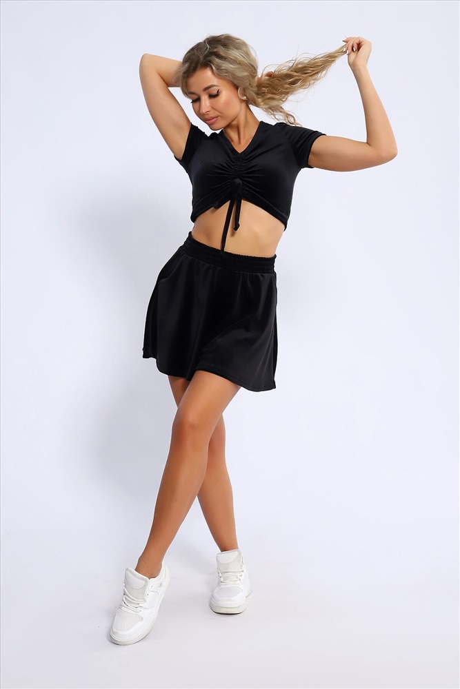 ID товара: 1020170 Состав: 92% Полиэстер, 8% Лайкра Сезон: Весна/Лето Длина: Средняя Фасон: Полуприлегающий Рукав: короткие Крой брючин: Широкий Декоративные элементы: Сборка Основная ткань: Полиэстер Стиль: повседневный Вид ткани: Велюр Страна бренда: Россия Страна производства: Россия Костюм выполнен из мягкого велюра. Нежный материал придает изделию благородный лоск, а сборка на завязках на груди топа и складки на юбке-шортах образуют роскошные переливы. Облегающий крой топа подчеркнет изгибы вашей фигуры, а укороченная длина акцентирует изящную талию. Юбка-шорты позволяет чувствовать себя уверенно и комфортно, не сковывает движения. Имеет глубокие карманы, позволяющие взять с собой всё необходимое. Юбка-шорты на резинке оригинального фасона, сочетается с любым верхом. Костюм подходит для любых мероприятий, от прогулки по городу, на природе, до танцев и спорта. Комментарии к товару