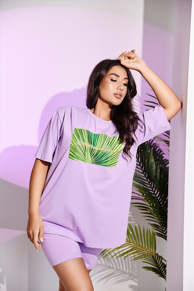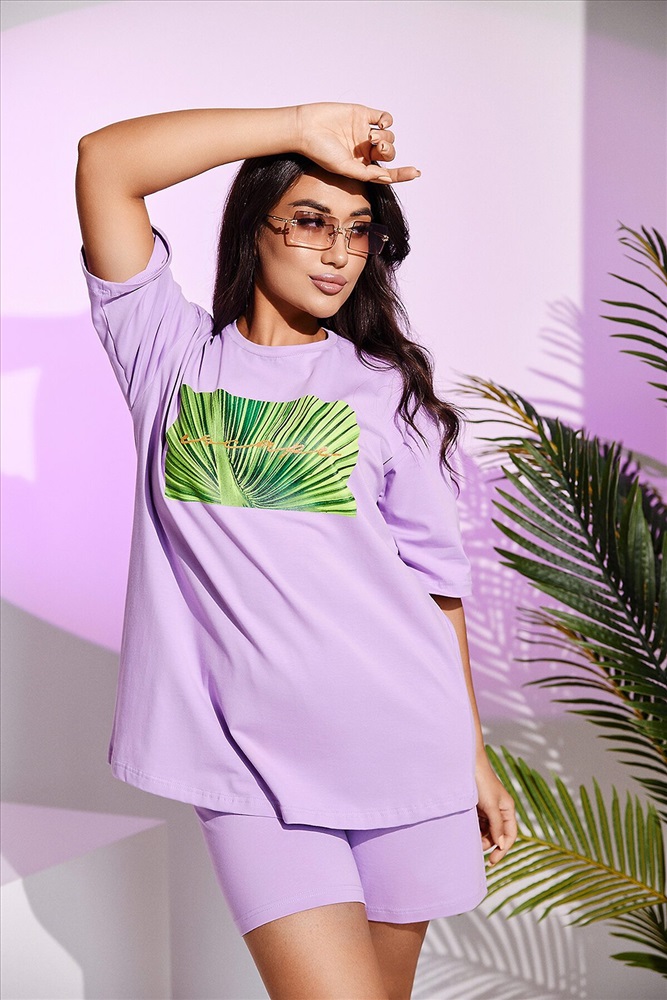 Костюм женский - свободные шорты с футболкой выполнен из кулирки с лайкрой. Спереди на футболке оригинальный принт. Горловина обработана бейкой, края подшиты, пояс на эластичной резинке. Костюм очень удобный и приятный к телу, идеально подойдет как для дома, так и для отдыха и прогулок.