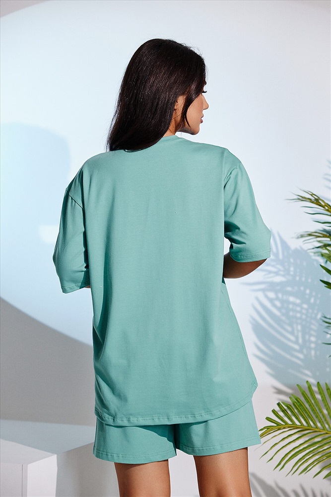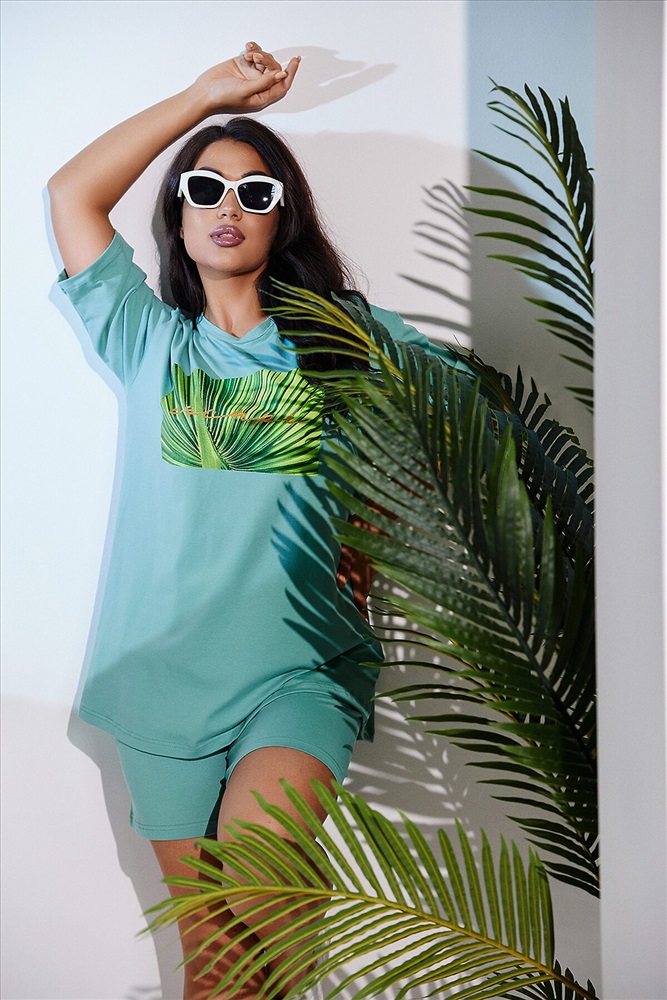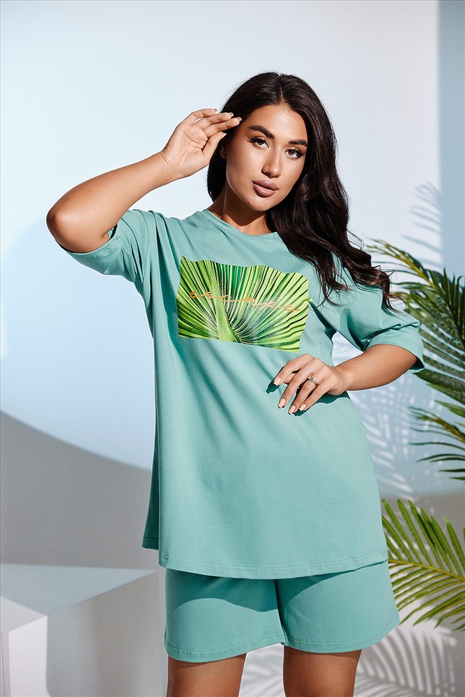 Костюм женский - свободные шорты с футболкой выполнен из кулирки с лайкрой. Спереди на футболке оригинальный принт. Горловина обработана бейкой, края подшиты, пояс на эластичной резинке. Костюм очень удобный и приятный к телу, идеально подойдет как для дома, так и для отдыха и прогулок.