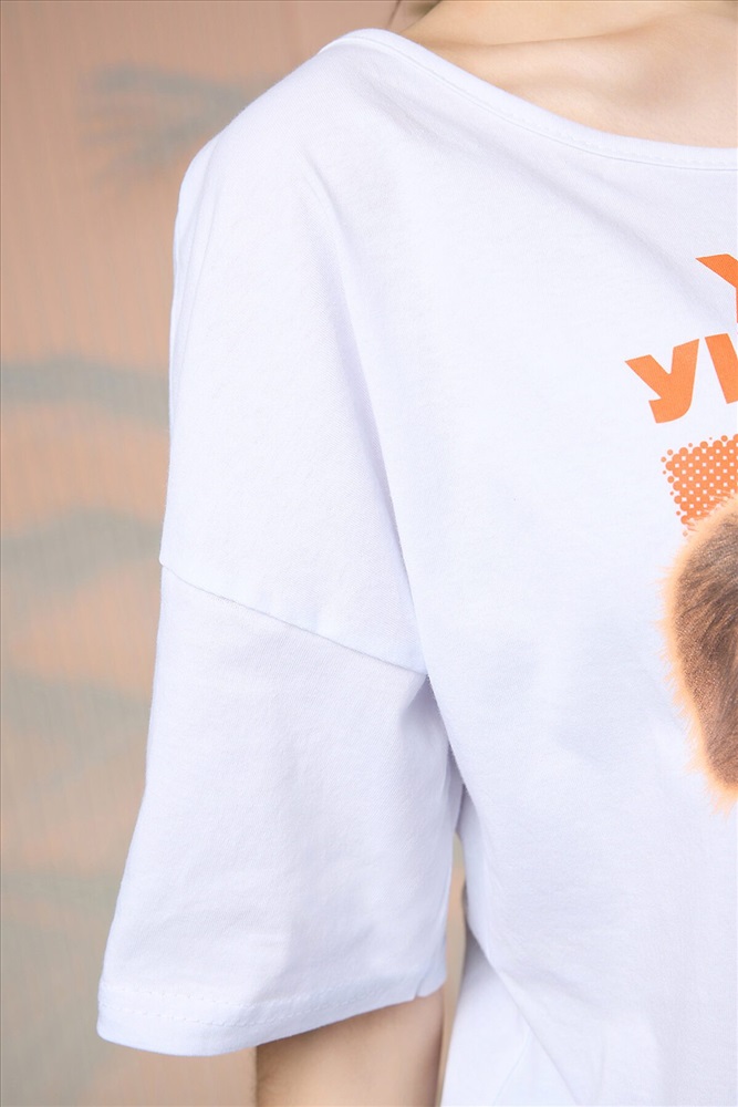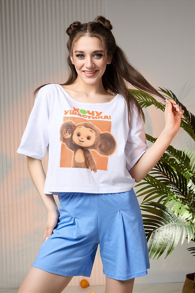 Костюм состоит из укороченной футболки оверсайз и шорт. Футболка с округлой горловиной. Рукав короткий. Горловина обработана бейкой из основного полотна. Шорты на резинке, со складками в верхней части передних половинок.
