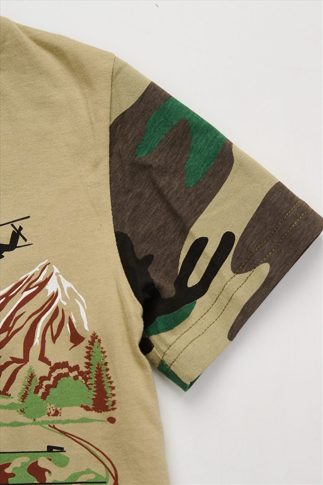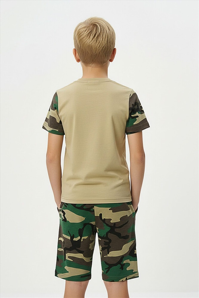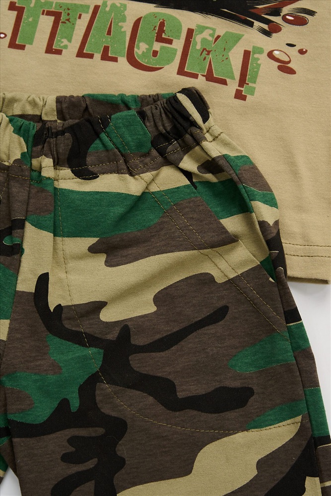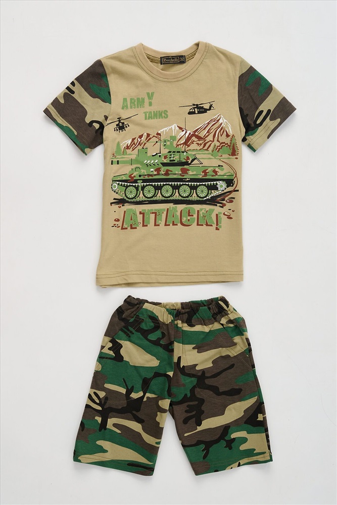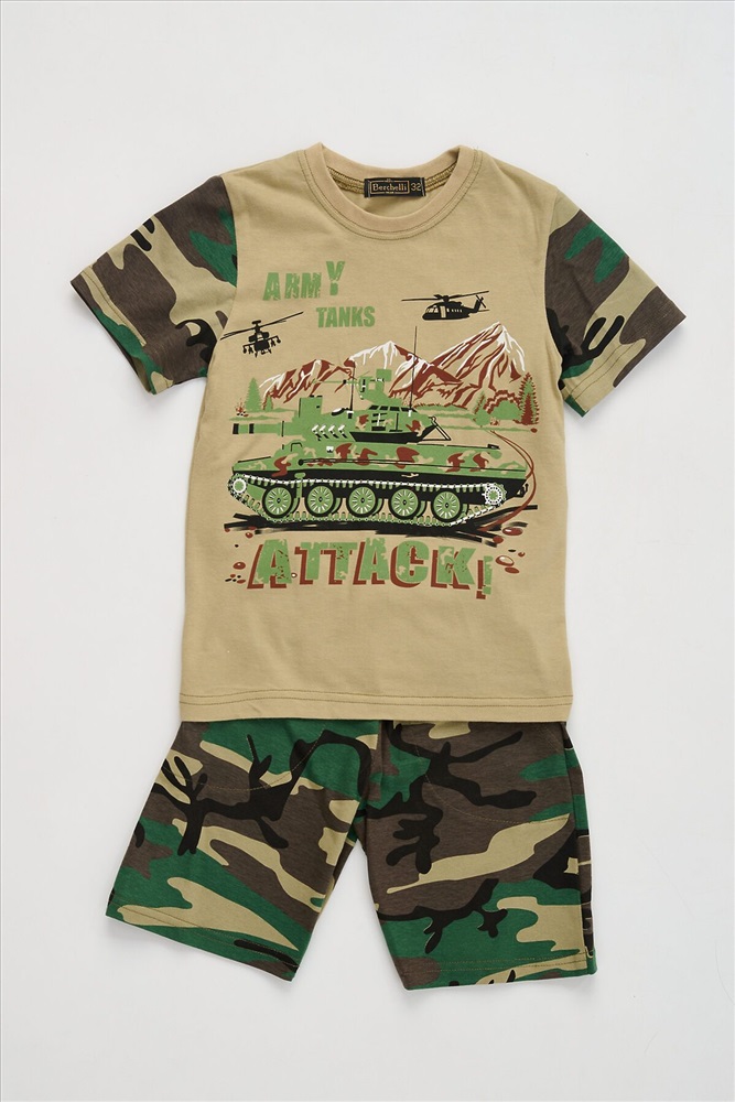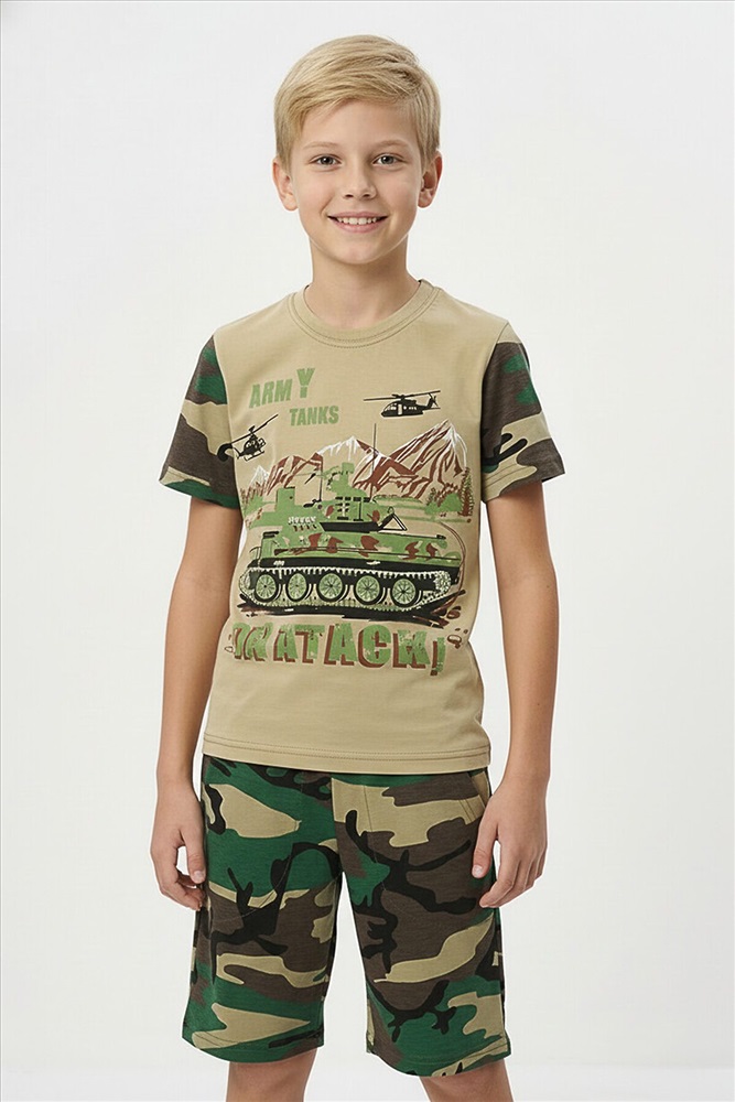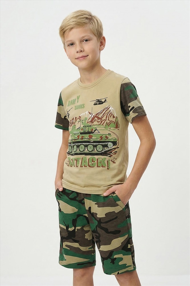 Костюм из кулирки для мальчиков футболка + шорты. Две расцветки пиксель и флора. Футболка с принтом в виде БМД, рукава камуфлированные. Шорты аналогичного камуфляжного дизайна, по бокам карманы, длина до коленей. Может быть парой мужскому костюму Десант (продается отдельно). Размеры от 26 до 38.