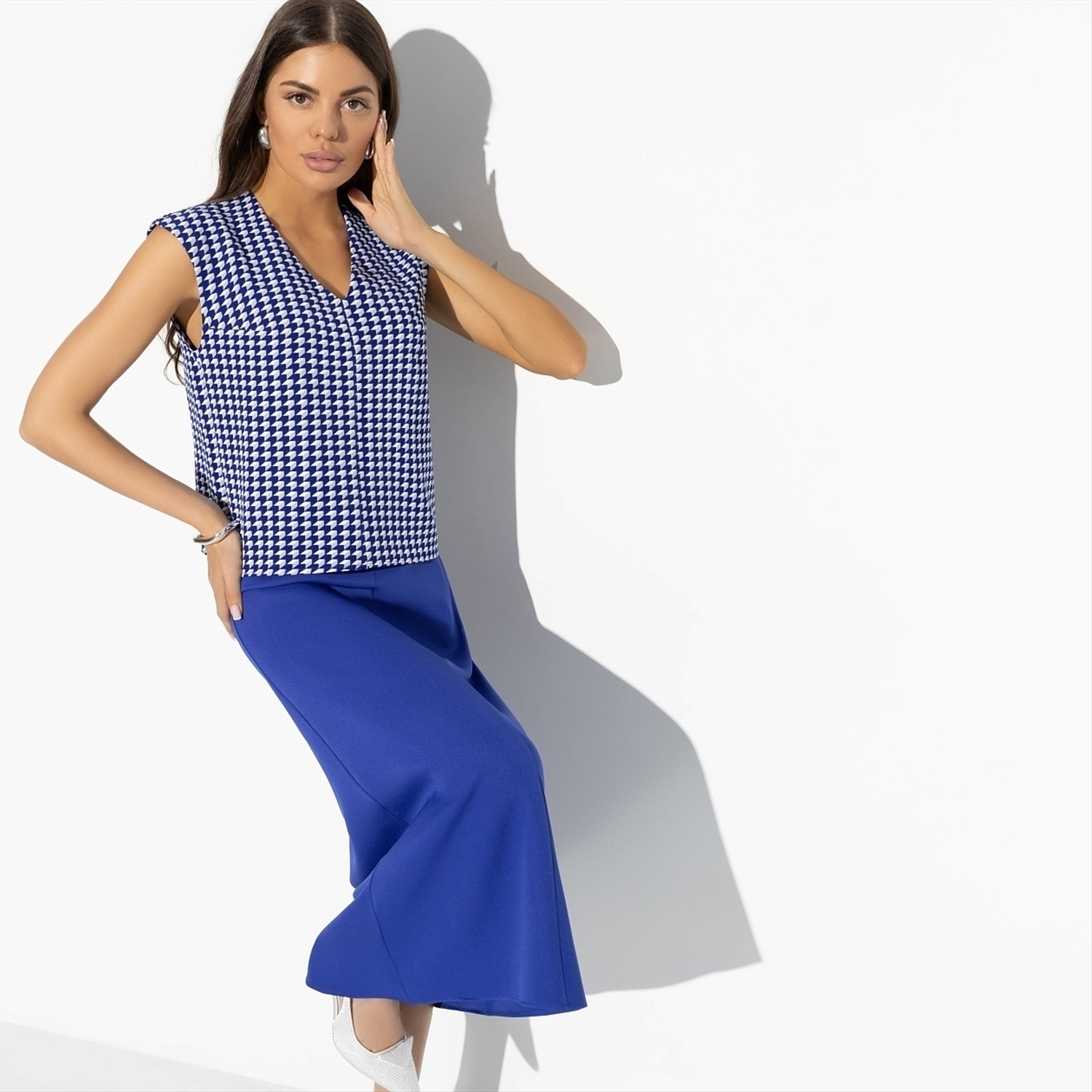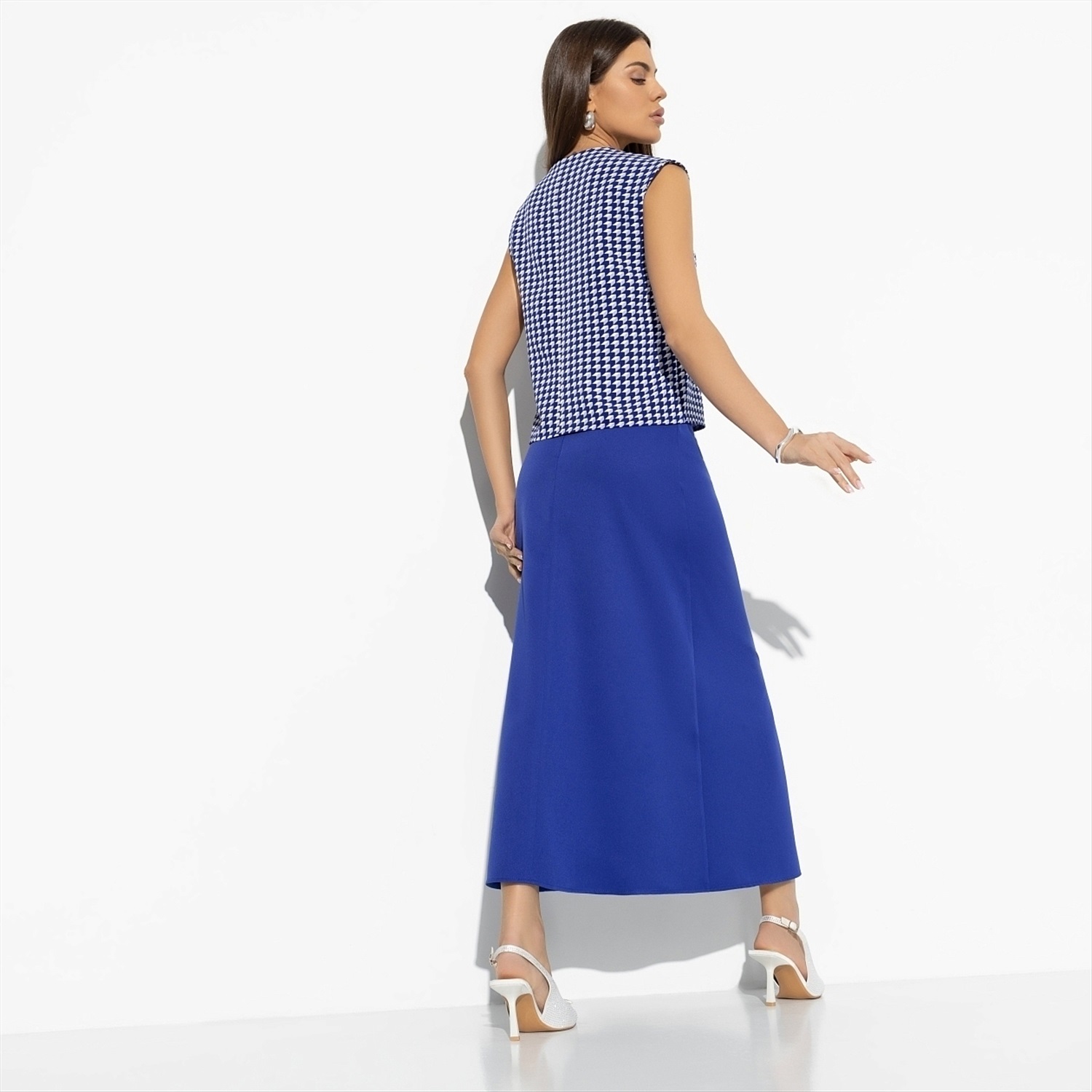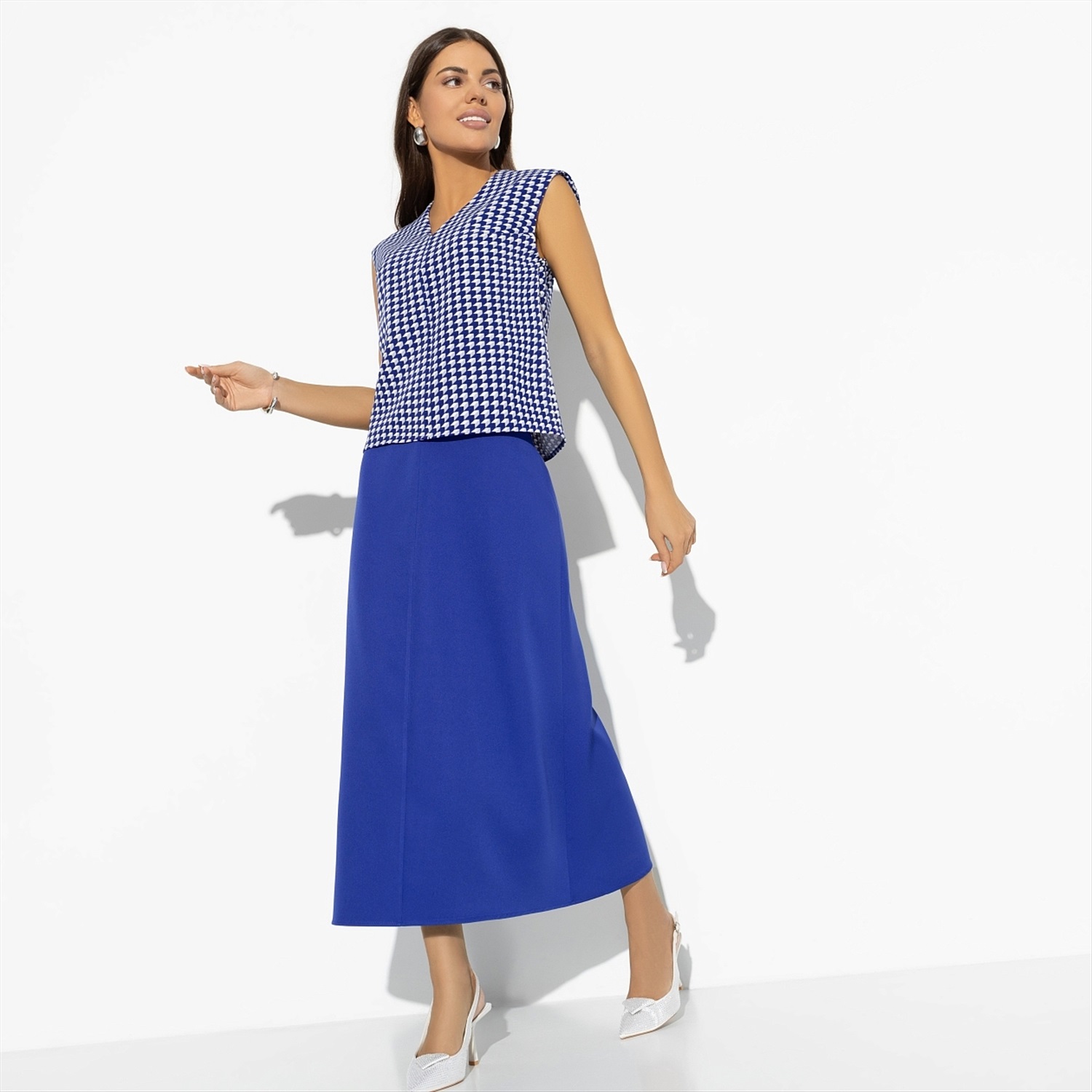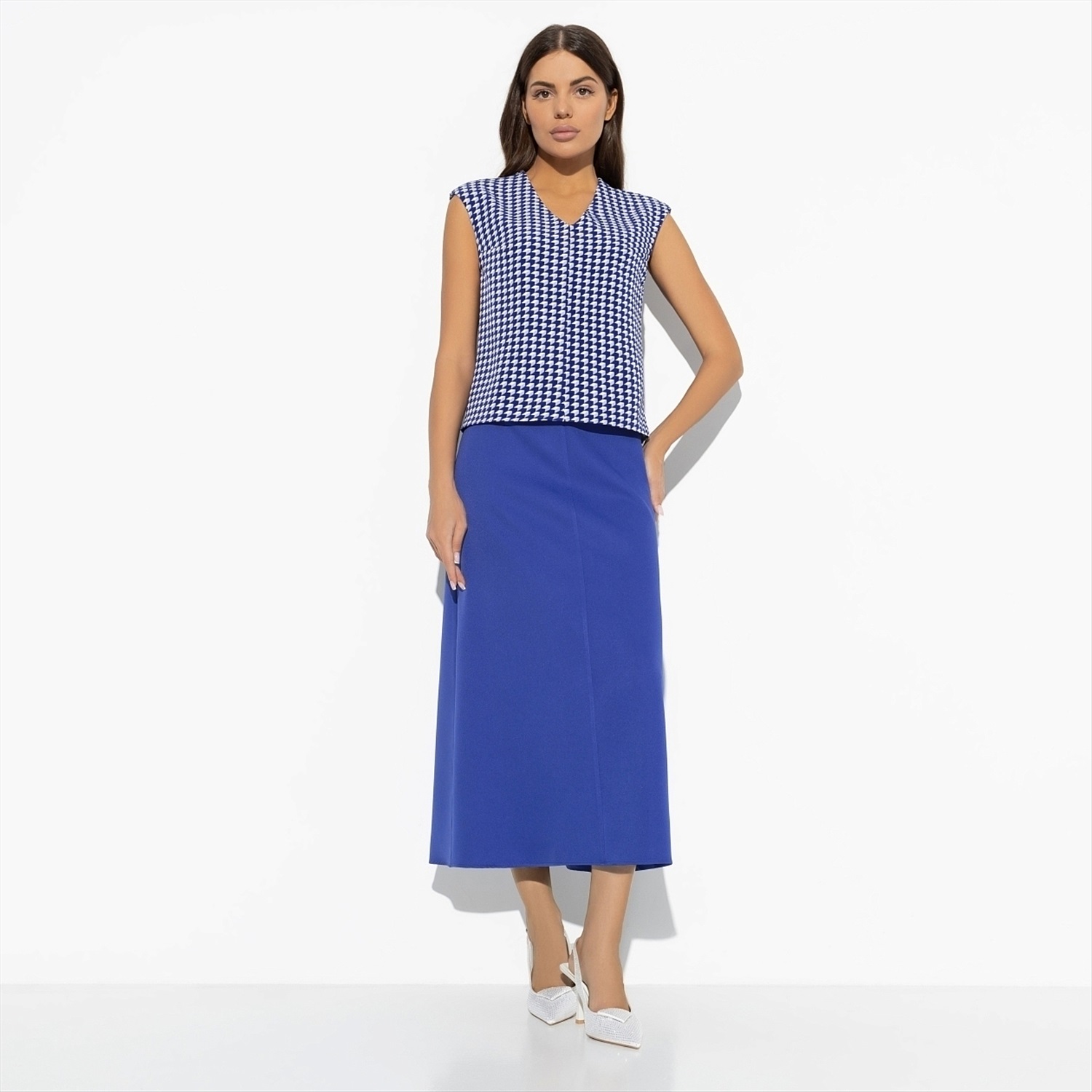 Бывают дни, когда нужно выглядеть на высоте, а настроения подбирать комбинации нет. Именно для таких случаев дизайнеры CHARUTTI создали костюм с юбкой в яркой синей гамме. Все придумано за вас. Ваше дело – купить и надеть. В комплект входит топ без рукавов и юбка-трапеция в длине миди. Топ без застежки. Юбка имеет скрытую молнию по задней части изделия.