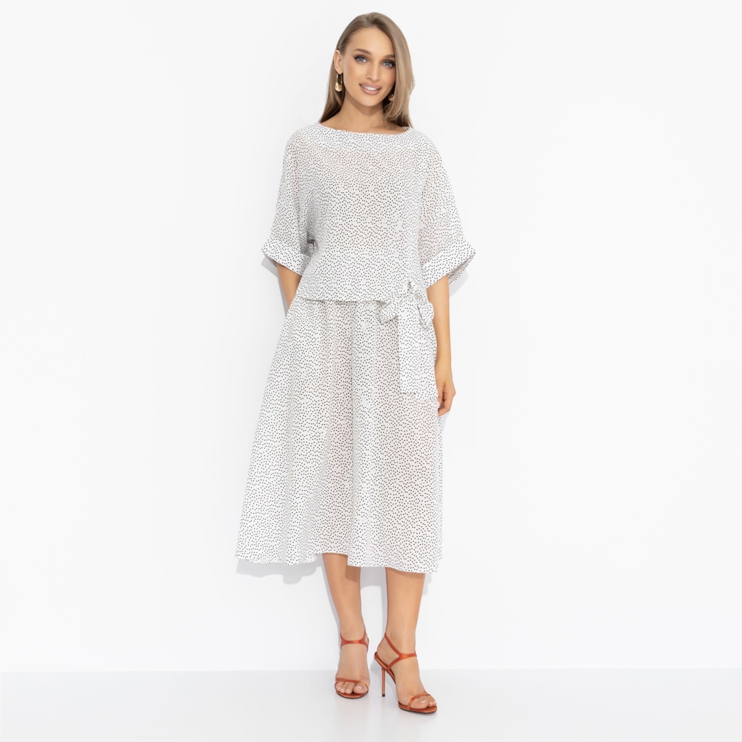 Ворваться в его жизнь было отличной идеей. Теперь тебя ждут регулярные ужины с его семьей в загородном поместье. В костюме с юбкой от ЧАРУТТИ легко понравиться его маме, так ты намекаешь на серьезные намерения. Комплект из блузы свободного кроя и юбки в длине миди. Юбка расклешенная, с карманами с двух сторон изделия. Пояс на широкой скрытой резинке. Блуза дополнена широкими вшитыми завязками.