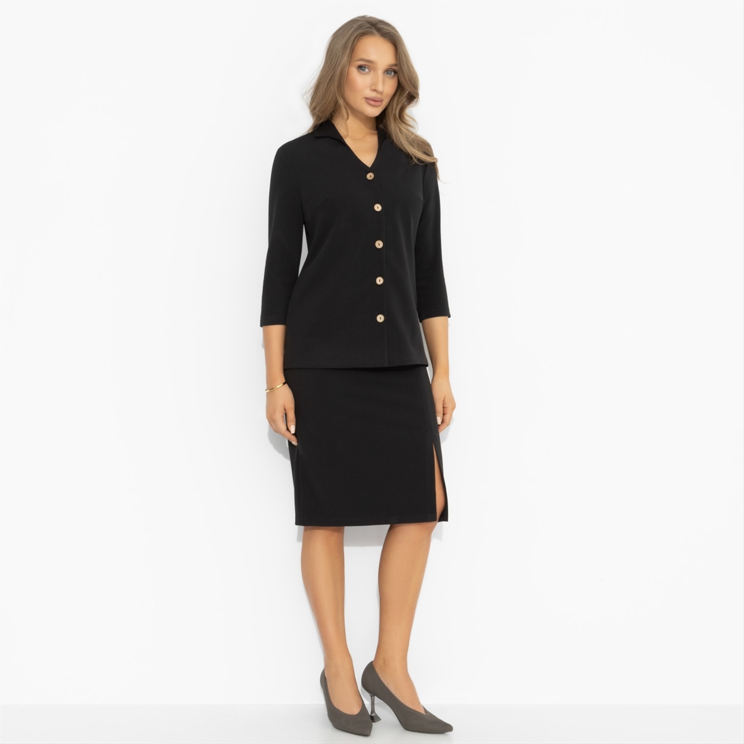 Состав: Трикотаж «оттоман» (65% п/э, 30% вискоза, 5% эластан) Плотность ткани: Средняя Тип ткани: Трикотаж Вид застежки: Пуговица/-ы, молния Высота посадки: Средняя Карманы: Нет Основной цвет ткани: Черный Подклад: Нет Резинка по талии: Нет Рисунок/раппорт: Каждое изделие уникально из-за расположения рисунка на ткани Сезон: Демисезон Силуэт: Приталенный Стиль: Классический Фасон юбки: Прямая Фасон юбки: Прямая Параметры модели на фото: