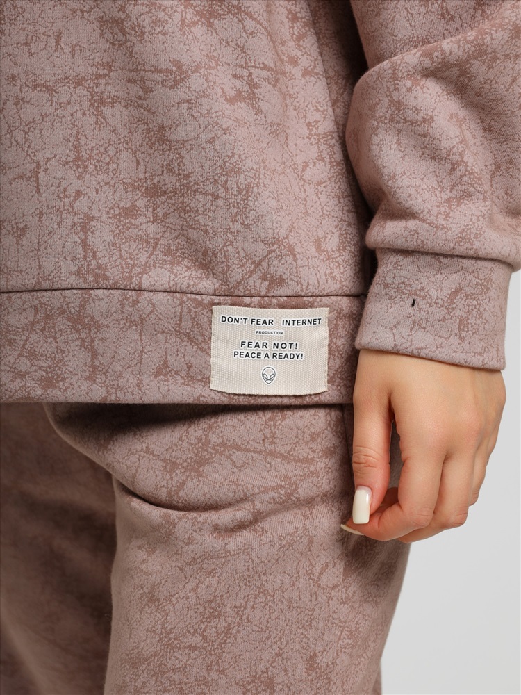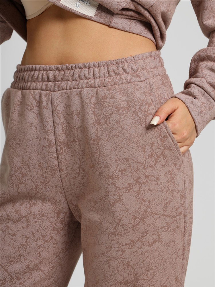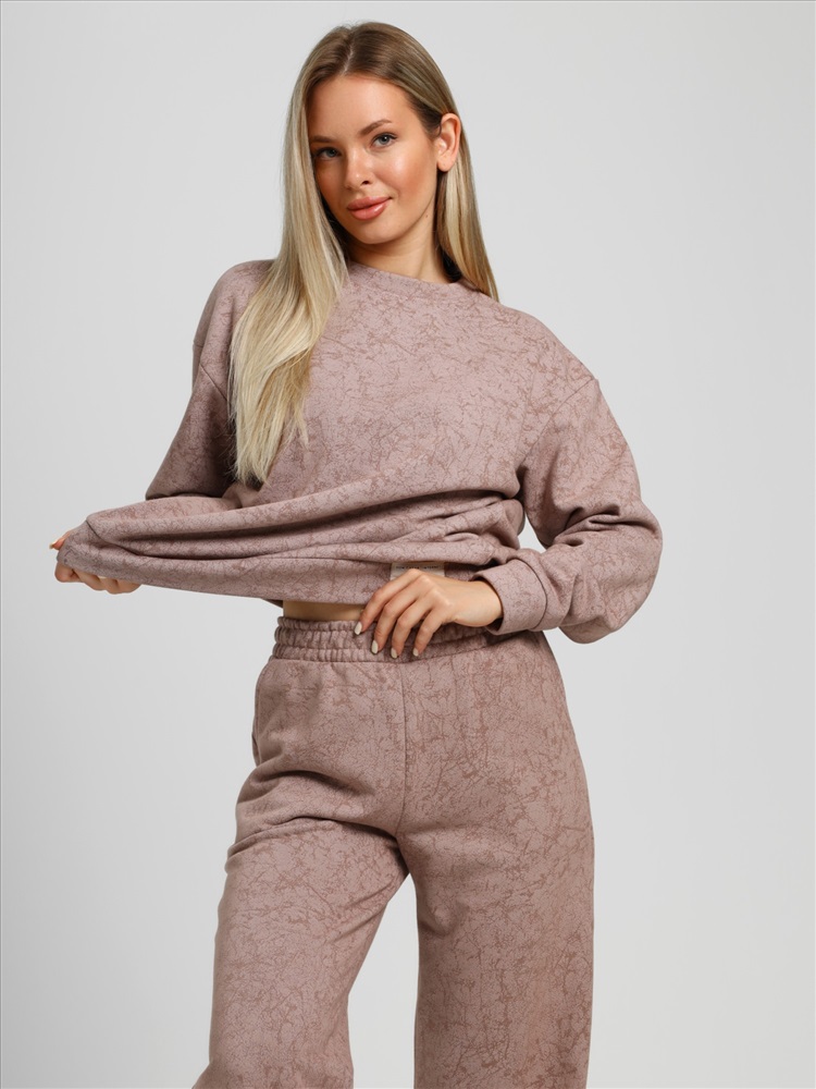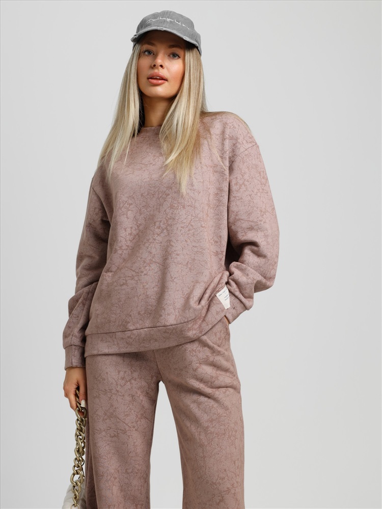 Состав: 88% хлопок, 12% ПЭ Ткань: Футер 3-х нитка Костюм молодежный из трикотажного полотна футер трехнитка с «эффектом замши», состоящий из джемпера и брюк. Джемпер – прямого силуэта, с длинными втачными рукавами, горловиной овальной формы, обработанной втачной планкой. Рукава с манжетами, низ - с притачным поясом, дополненным декоративным элементом-нашивкой.Брюки – длинные, свободные, на притачном поясе с эластичной тесьмой внутри, карманами в боковых швах.
