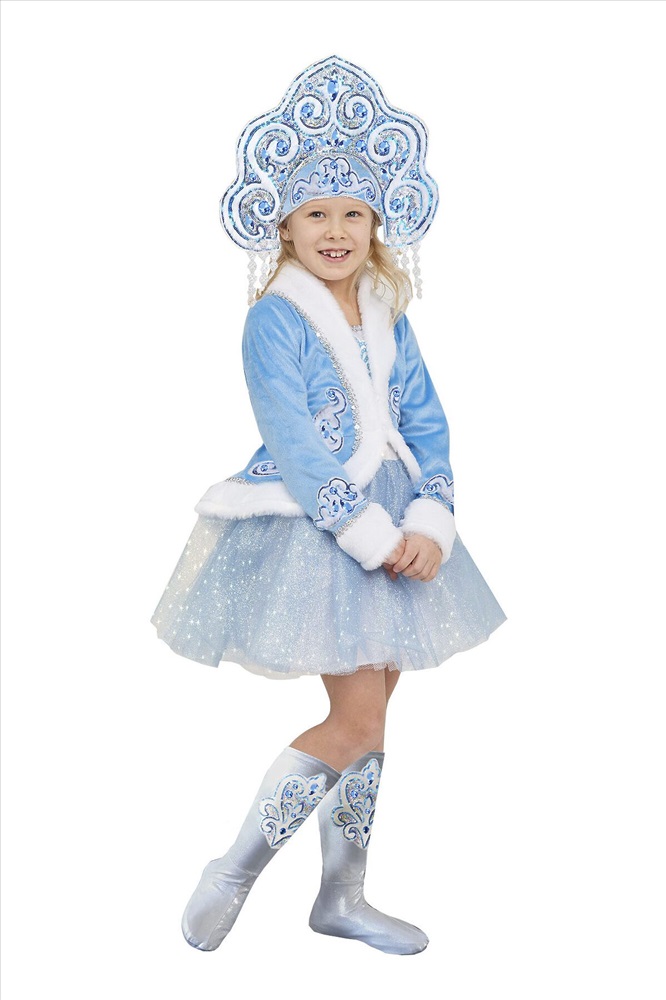 ID товара: 959902 Состав: Сатин, иск.мех Сезон: Осень/Зима Длина: Средняя Фасон: Расклешенный Рукав: длинные Стиль: Нарядный Страна бренда: Россия Страна производства: Россия Костюм Снегурочки Полины детский новогодний - яркий и самобытный образ для запоминающихся праздников. В комплект входит платье, шуба, кокошник, сапожки. Особенности: Платье короткое пышное голубое с блестками Укороченная шуба с белым мехом по краям Роскошный кокошник с узорами Сапожки блестящие с узором Комментарии к товару