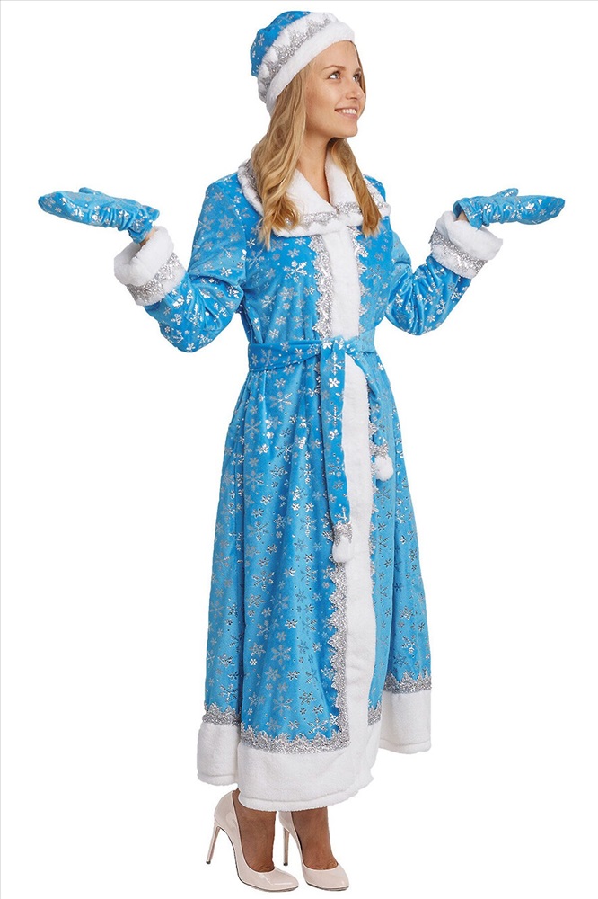 Карнавальный костюм Снегурочка из нашей коллекции для взрослых – невероятно женственный и утонченный образ. В таком наряде будет невозможно избежать комплиментов и даже затмить самого Деда Мороза. Длинная шубка нежно-голубого цвета с принтом в виде снежинок понравится любой девушке. А главное: в этом наряде будет комфортно и тепло, даже если праздник будет проводиться на свежем воздухе. В комплект, помимо шубы, входит пояс, шапка и рукавицы.