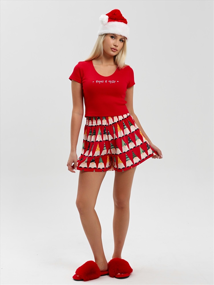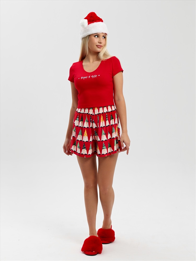 Состав: В-95%хлопок,5%лайкра / Н-95%ПЭ,5%спандекс Ткань: В-Кашкорсе/Н-Велюр стрейч Костюм молодежный из трикотажного полотна двух видов: «кашкорсе» и «велюр стрейч», состоящий из футболки и шорт. Футболка – из гладкокрашеного полотна «кашкорсе», классического покроя, с короткими втачными рукавами, горловиной V-образной формы, окантованной основным материалом, принтом на полочке, выполненным в технике «шелкографии».Шорты – из полотна «велюр стрейч » с набивным рисунком, средней длины, широкие, с эластичной тесьмой по талии.