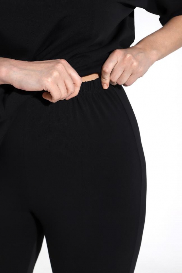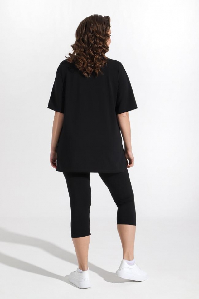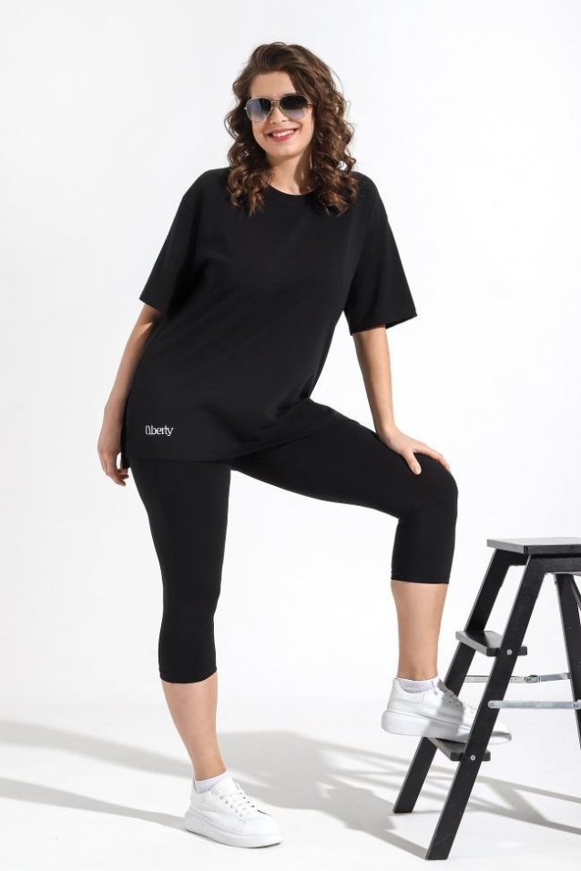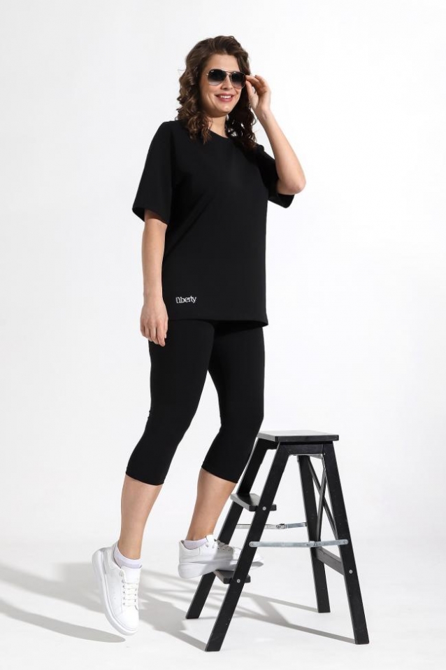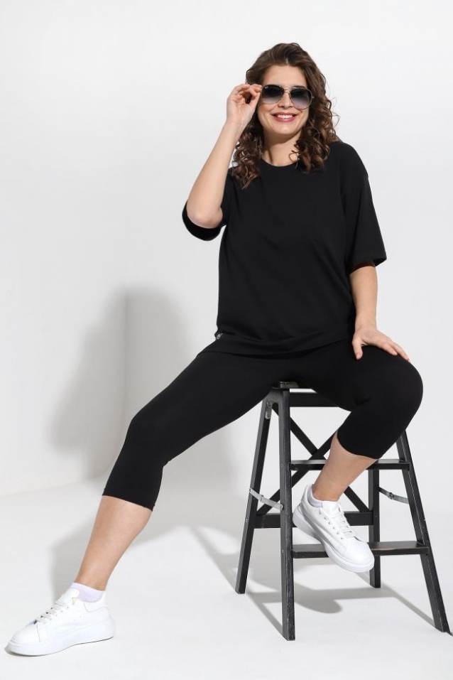 Костюм женский из трикотажного гладкокрашенного полотна «кулирка с лайкрой», состоящий из футболки и бридж. Футболка свободного покроя, со спущенным плечом и втачными рукавами длиной до локтя, горловиной овальной формы, обработанной втачной планкой и принтом на полочке, выполненным в технике «шелкографии». В нижней части боковых швов – разрезы.Бриджи – классического покроя, на резинке Комментарии к товару