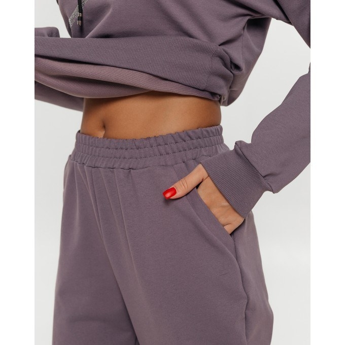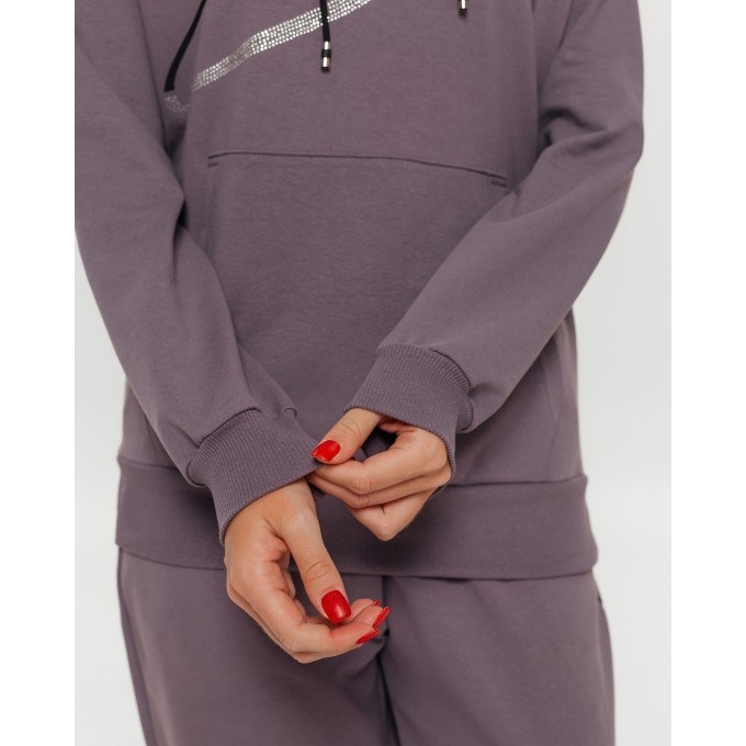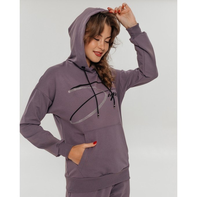 Костюм СУПЕР, состоящий из кофты и брюк с карманами. Кофта с капюшоном, край которого стягивает декоративный шнурок с оригинальным наконечником. Длинный рукав. Дополнением к образу служит стильная печать со стразами.