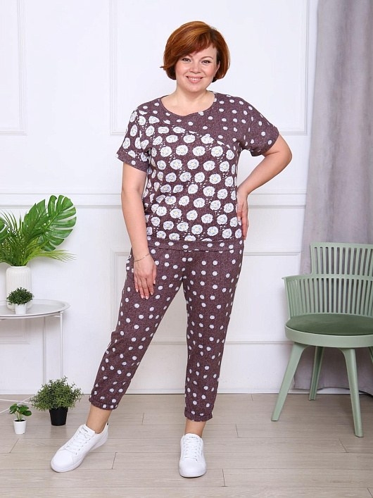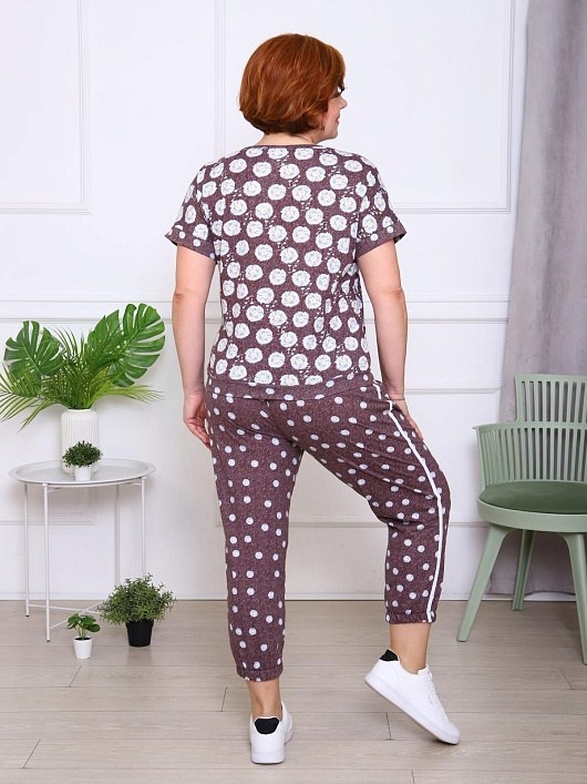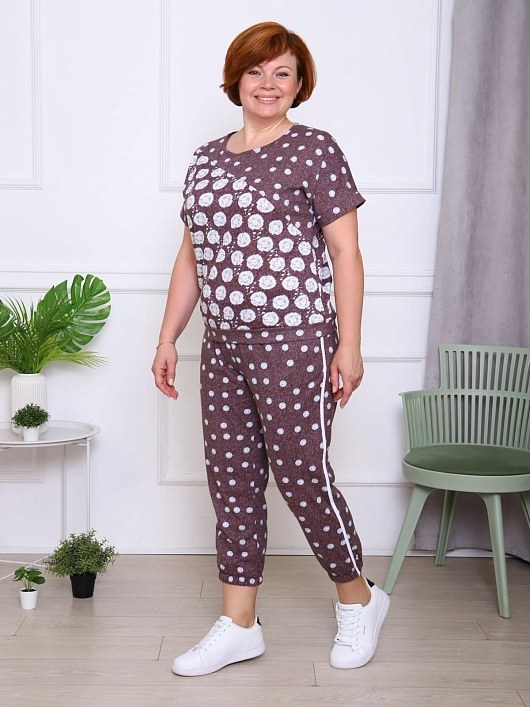 Универсальный трикотажный костюм из полотна "кулирка". Свободные брюки длиной до щиколоток, с карманами в боковом шве, с эластичной тесьмой на поясе, низ брюк собран на широкую резинку. Брюки декорированы лампасами из отделочной ткани. Футболка свободного покроя со спущенным плечом. Костюм для девушек и женщин, любящих удобство и комфорт в одежде. Комментарии к товару