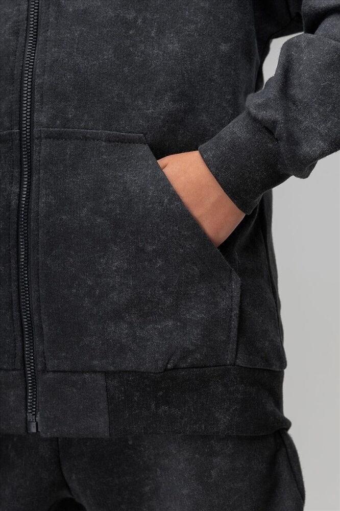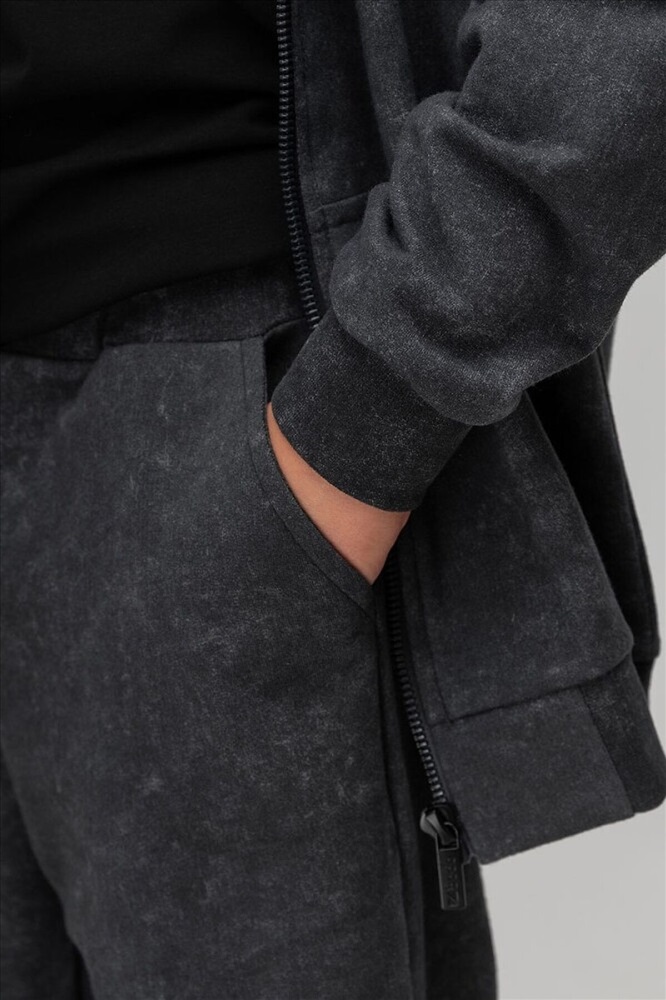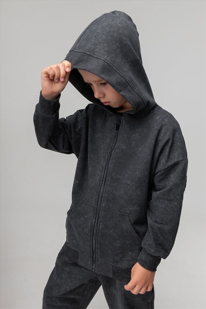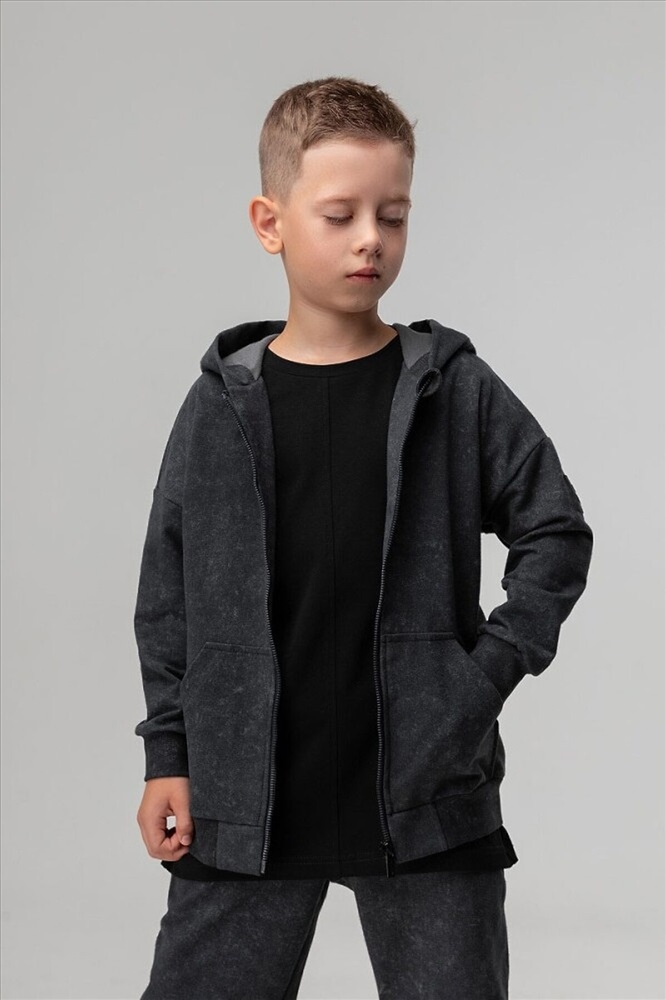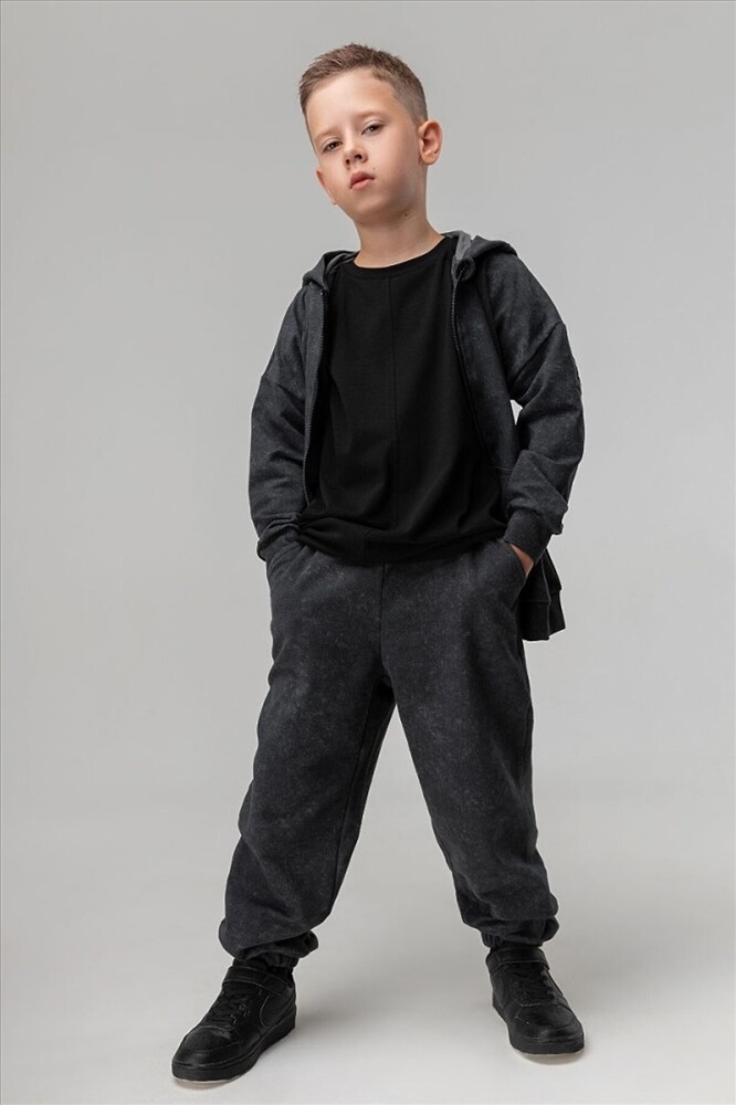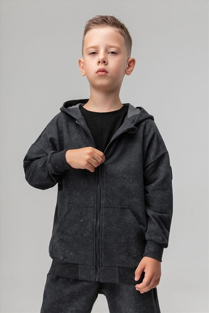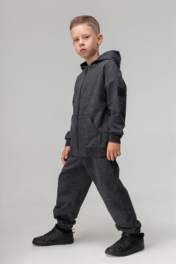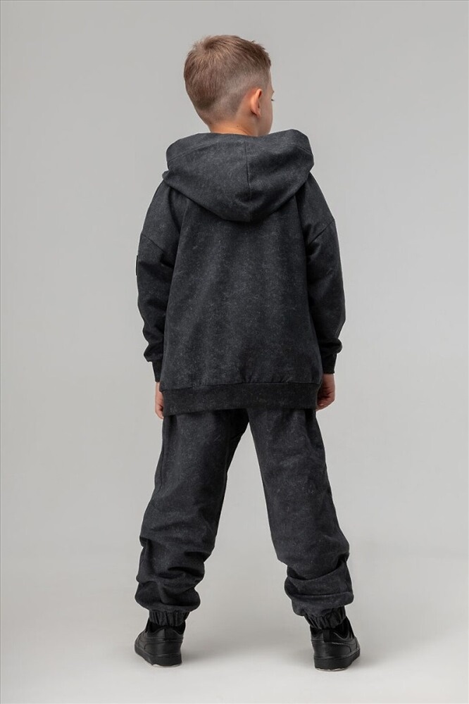 Костюм для детей дошкольного возраста. Толстовка прямого силуэта свободная с застёжкой на молнию, со спущенным плечом с втачным длинным рукавом с притачной манжетой. Толстовка с поясом по низу изделия. Капюшон без подкладки.Брюки прямые свободные на притачном поясе с внутренней резинкой. Низ брюк с цельнокроеной манжетой на резинке. Брюки с боковыми карманами.