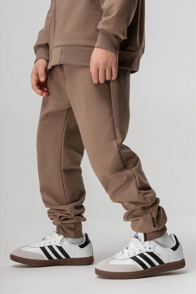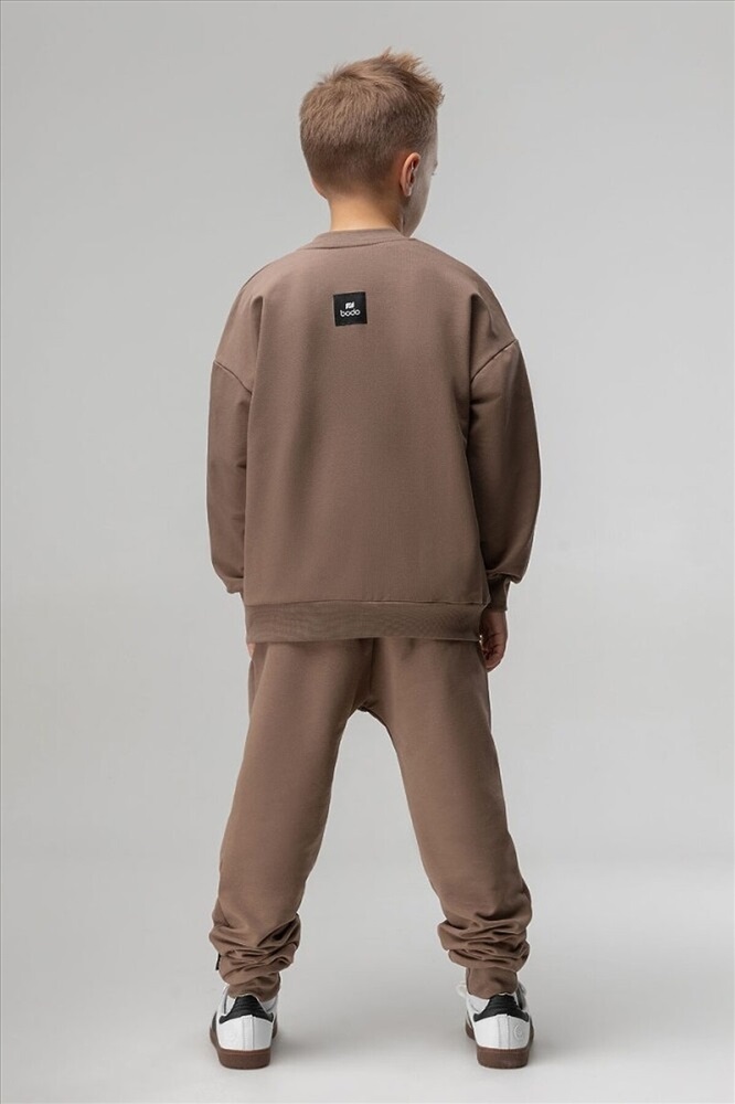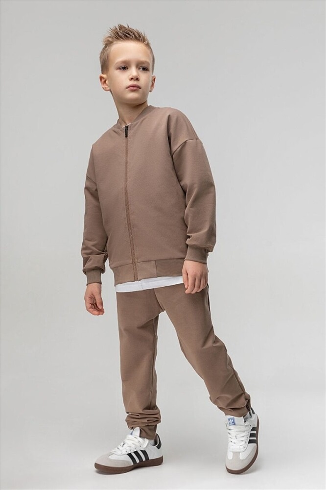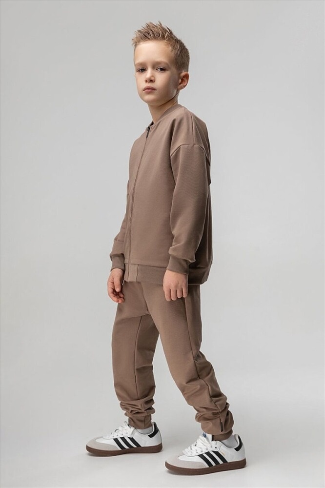 Костюм для детей дошкольного возраста. Бомбер прямого силуэта свободный с центральной бортовой застёжкой на молнию, со спущенным плечом с втачным длинным рукавом с притачной манжетой. Бомбер с поясом по низу изделия. Горловина округлой формы. Брюки прямые свободные на притачном поясе с внутренней резинкой, на притачной манжете по низу изделия.