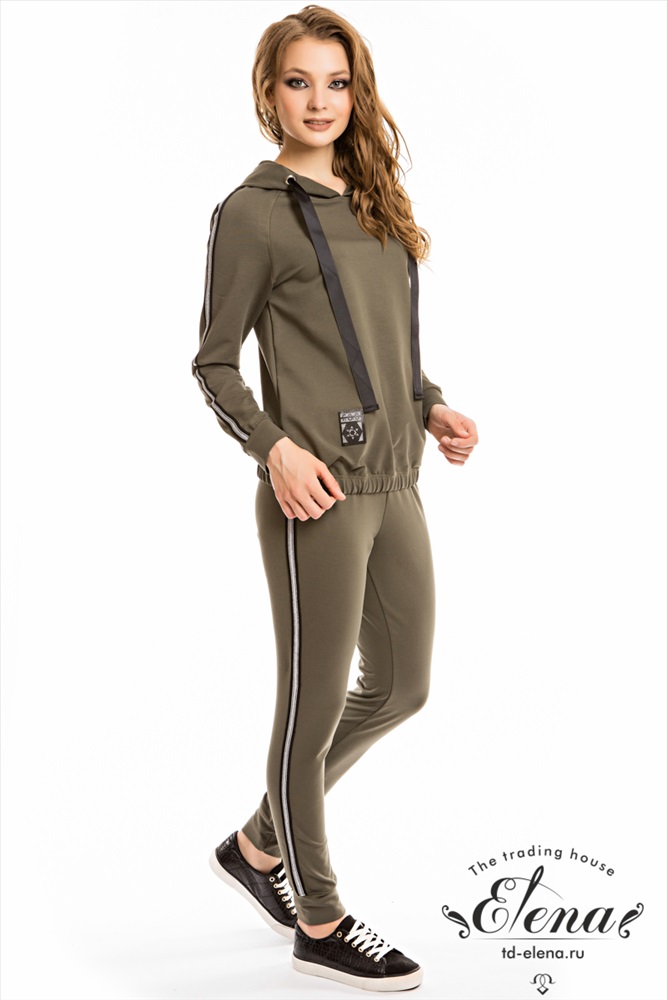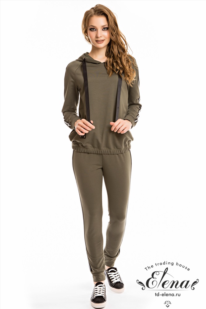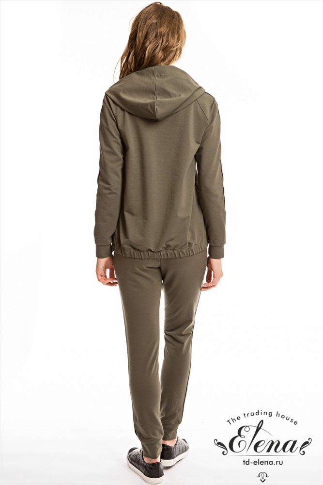 С капюшоном: Да С карманами: Нет Сезон: Всесезонный Состав: Хлопок 95% Лайкра 5% Цвет Номенклатуры: хаки Спортивный костюм из однотонной футер петли с лайкрой. Состоит из брюк и толстовки. Толстовка свободного покроя, с рукавом реглан, капюшоном и собрана по низу на резинку. На брюках и рукавах настрочена лампасная тесьма. В люверсы капюшона вставлена репсовая лента. Спереди на толстовке расположена декоративная нашивка. Брюки с поясом на резинке и манжетами. Комментарии к товару
