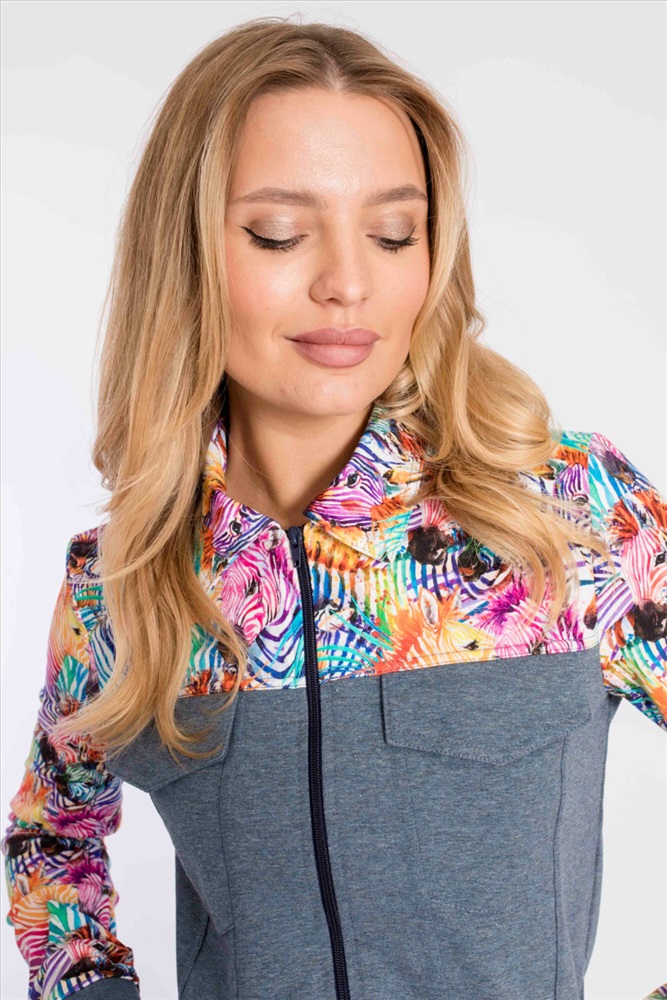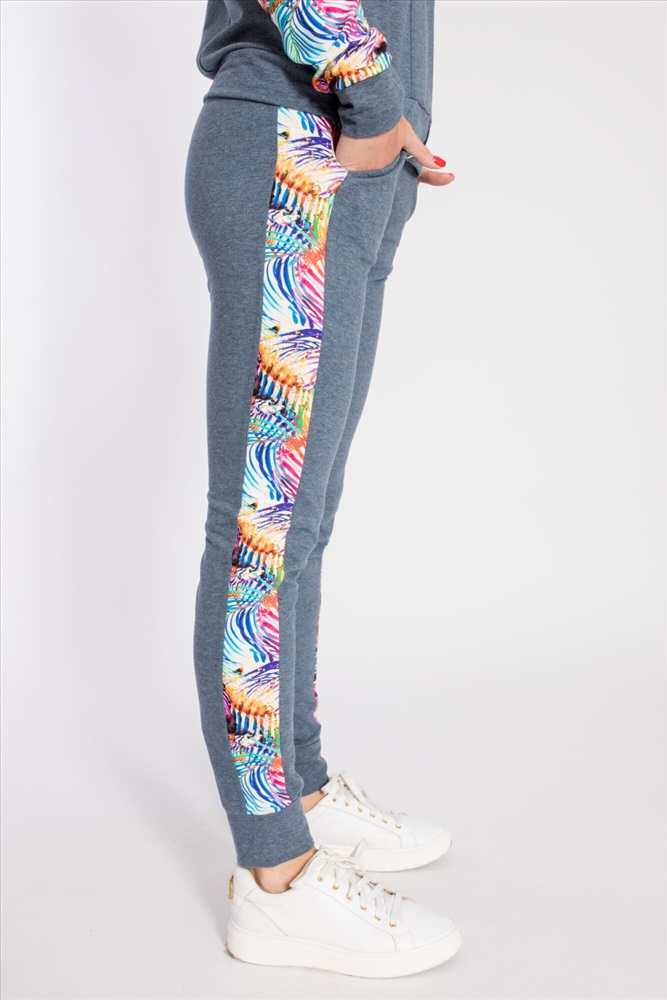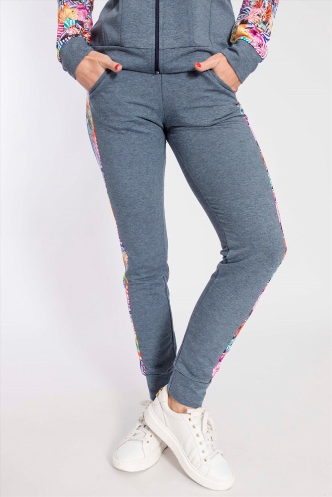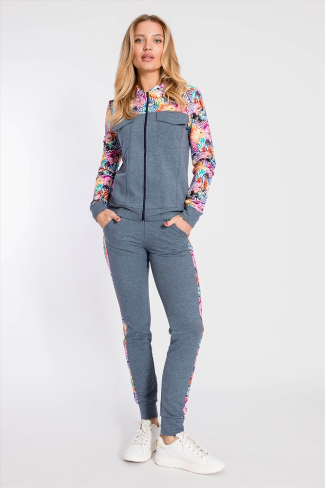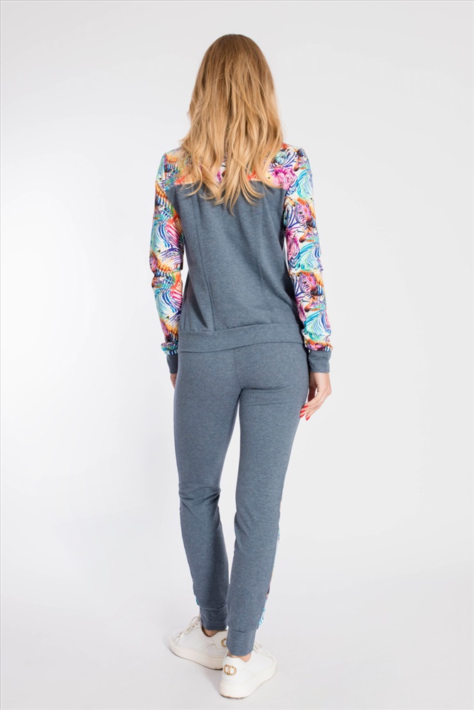 Застежка: Молния С капюшоном: Нет С карманами: Да Сезон: Всесезонный Состав: Хлопок 95% Лайкра 5% Цвет Номенклатуры: индиго Костюм выполнен из футер петли с лайкрой, состоит из брюк и толстовки с застёжкой на молнию. Основное полотно однотонное, отделочные элементы из полотна с набивным рисунком. Брюки с поясом на резине и манжетами внизу, по бокам размещены карманы. Толстовка с отложным воротником, притачным поясом и манжетами. Спереди два кармана. Комментарии к товару