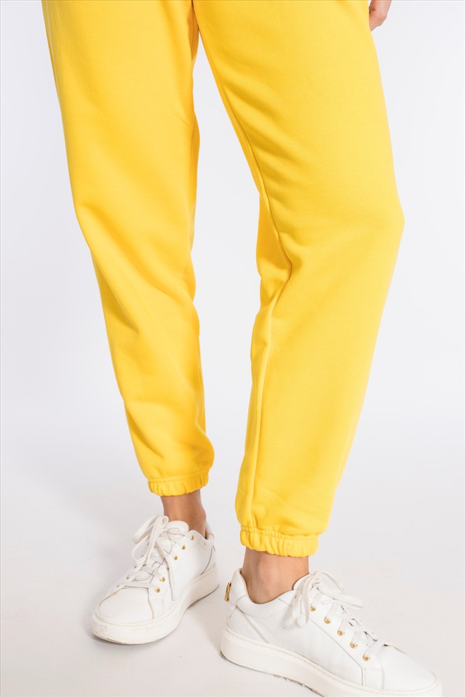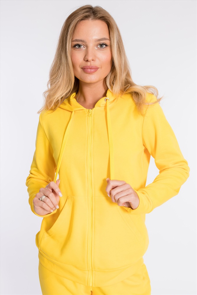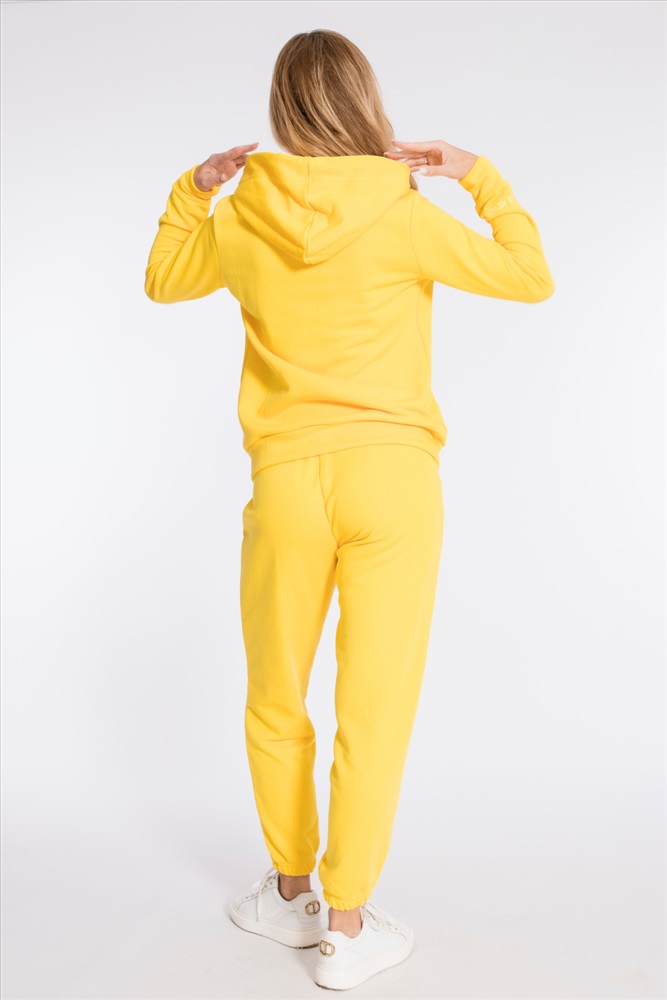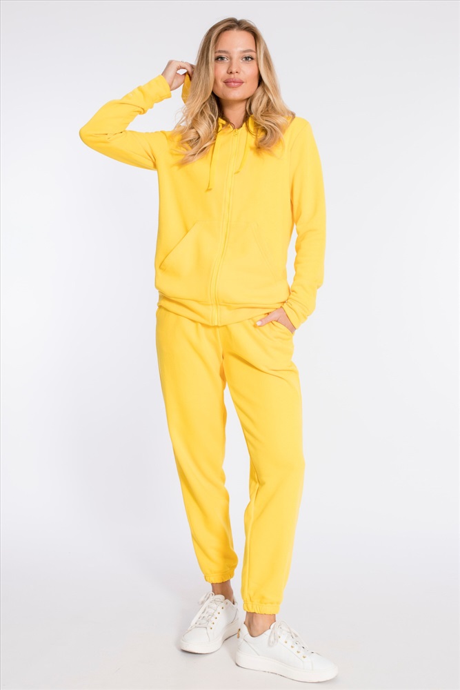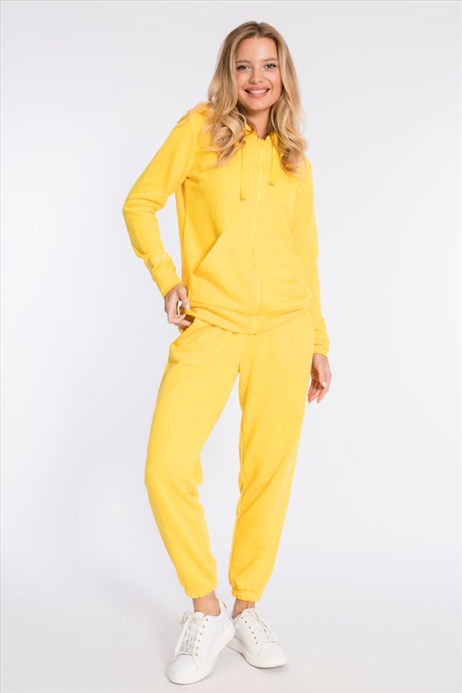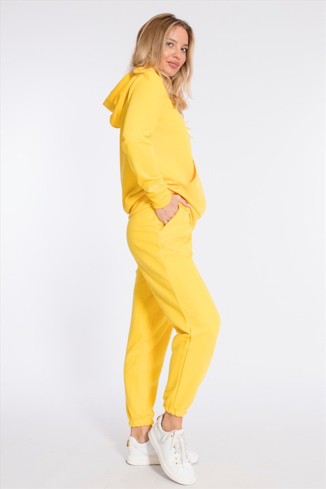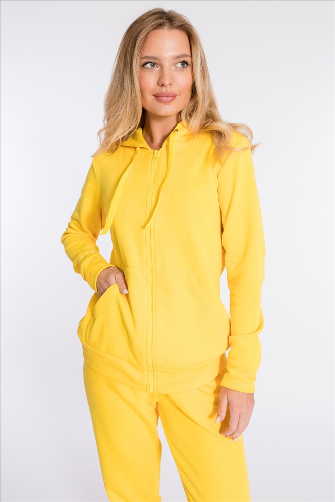 Цвет Номенклатуры: желтый Костюм выполнен из однотонного футера "воздушки". Толстовка с капюшоном, застежкой на молнию и карманами кенгуру. На правом рукаве вышивка. Брюки с боковыми карманами и притачным поясом, низ на резинке. Сверху на брюках размещена вышивка.