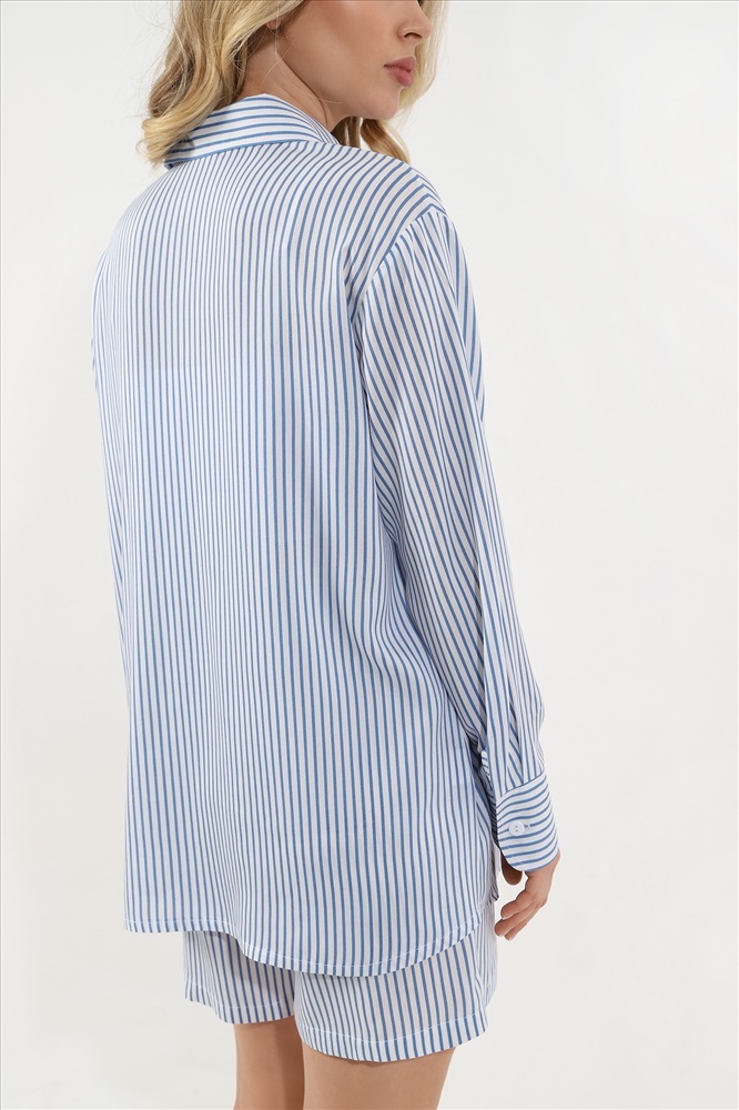 Состав: 100% вискоза Ткань: Штапель Костюм молодежный из штапельного полотна с набивным рисунком «полоска», состоящий из блузки-рубашки и шорт.Блузка-рубашка свободного кроя, со стояче-отложным воротником, спущенным длинным рукавом. Перед из двух частей с центральной бортовой застежкой на петли и пуговицы, спинка цельнокроеная. Низ рукава с притачной манжетой, застегивающейся на петлю и пуговицу.Шорты свободные, средней длины, на притачном поясе с эластичной тесьмой внутри, карманами в боковых швах.