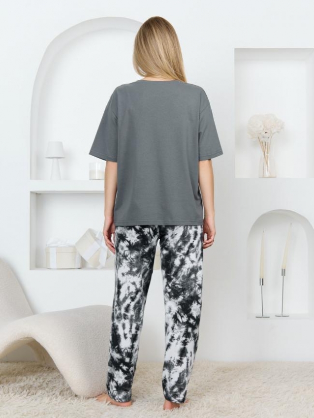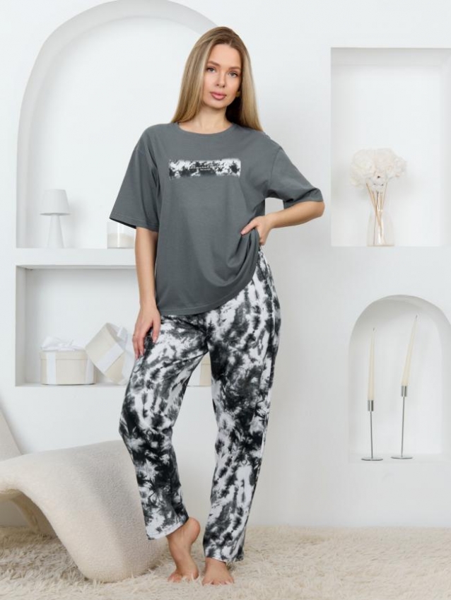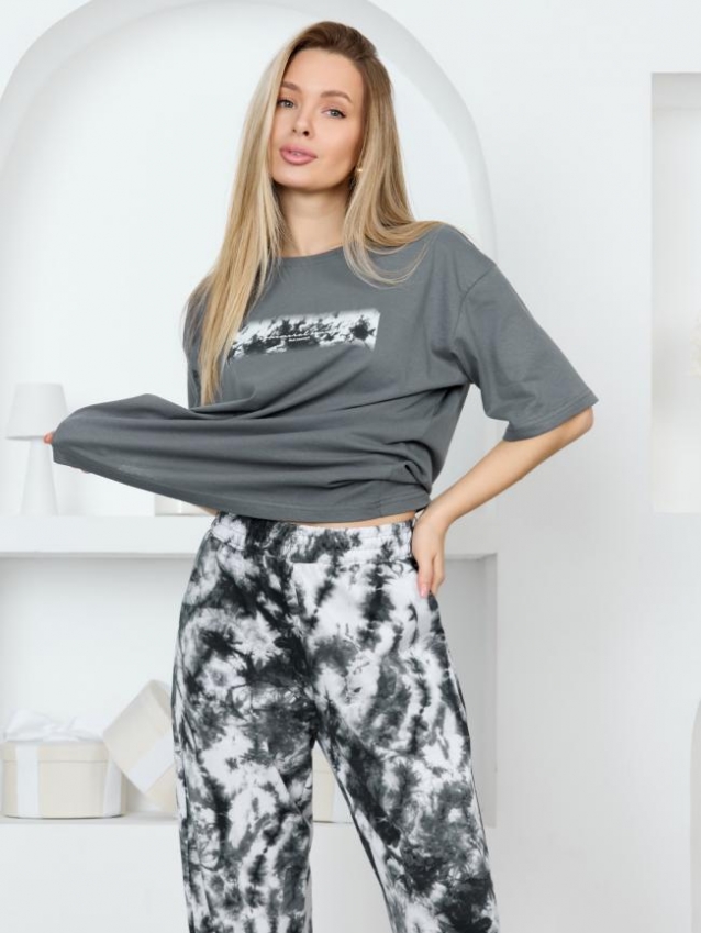 Костюм молодежный из трикотажного полотна «кулирка» в сочетании двух видов тканей гладкокрашеной и с набивным рисунком, состоящий из футболки и брюк.Футболка – свободного покроя из гладкокрашеного полотна, с короткими втачными рукавами, горловиной овальной формы, обработанной притачной бейкой, выполненным в технике «шелкографии».Брюки - из полотна с набивным рисунком, прямые, длинные, с карманами в боковых швах, на притачном поясе с эластичной тесьмой внутри. Комментарии к товару