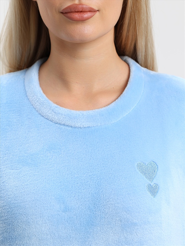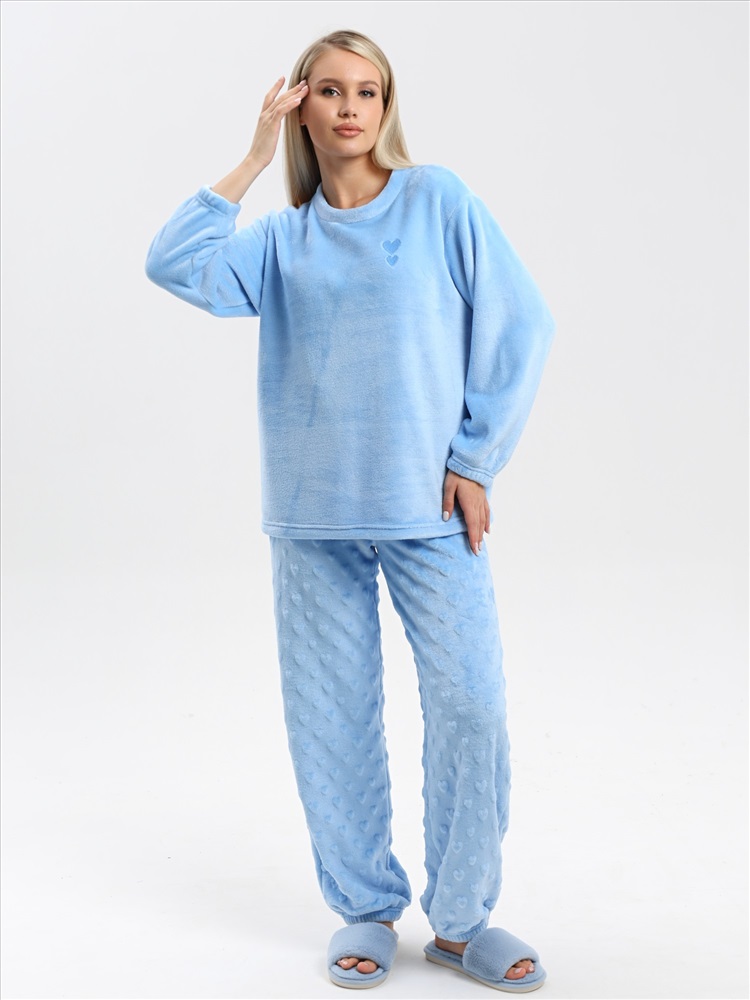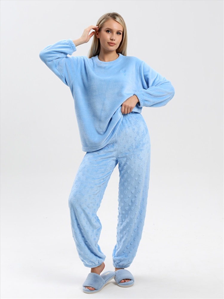 Состав: 100% ПЭ Ткань: Велсофт Костюм молодежный из трикотажного полотна «велсофт» в комбинации двух видов, состоящий из джемпера и брюк. Джемпер – из гладкого полотна, свободного покроя, с длинными втачными рукавами, нижние срезы которых обработаны эластичной тесьмой,и горловиной овальной формы, обработанной втачной планкой. С левой стороны на полочке вышивка.Брюки - из полотна со стриженым узором «сердечки», без карманов, с эластичной тесьмой по талии и нижним срезам.