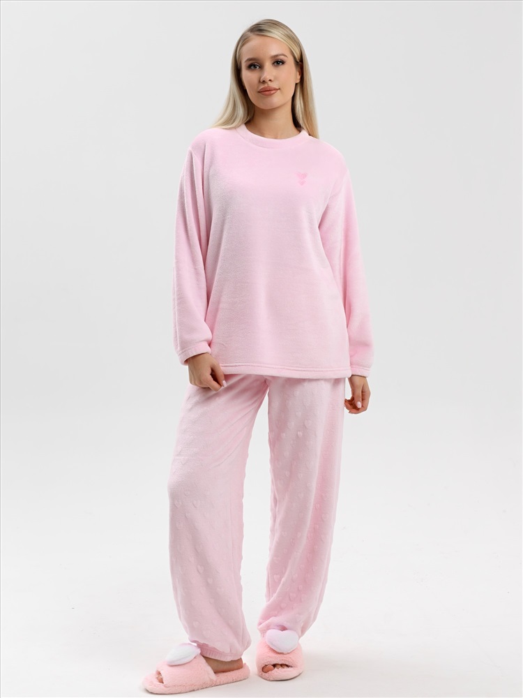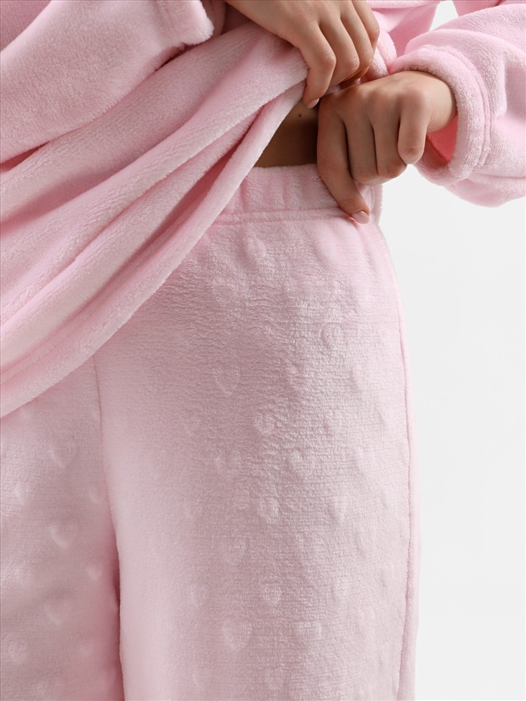 Состав: 100% ПЭ Ткань: Велсофт Костюм молодежный из трикотажного полотна «велсофт» в комбинации двух видов, состоящий из джемпера и брюк. Джемпер – из гладкого полотна, свободного покроя, с длинными втачными рукавами, нижние срезы которых обработаны эластичной тесьмой,и горловиной овальной формы, обработанной втачной планкой. С левой стороны на полочке вышивка.Брюки - из полотна со стриженым узором «сердечки», без карманов, с эластичной тесьмой по талии и нижним срезам.