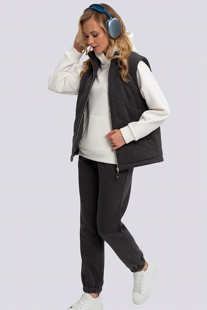 Теплый спортивный костюм женский с жилеткой на молнии - это комплект, представляющий собой идеальное сочетание стиля и функциональности для активного образа жизни и спокойных прогулок на свежем воздухе. Он создан для девушек и женщин, предпочитающих комфорт и тепло в прохладное и холодное время года. Теплый костюм выполнен из плотного, качественного футера с мягким начёсом внутри, приятным к телу. Это делает его идеальным выбором для весеннего, осеннего и зимнего времени года. Комплект включает в себя худи с капюшоном, брюки, стёганную утеплённую жилетку на молнии. На рукавах и брюках есть фиксирующие манжеты на резинке, которые позволяют сохранять тепло. Декоративные элементы в виде стёжки ромб придают костюму уникальный и запоминающийся вид. Костюм может легко сочетаться с вашей повседневной одеждой и спортивной обувью, создавая гармоничный и стильный образ. Он станет отличным дополнением к вашему гардеробу, сочетая в себе высокое качество, современный дизайн и максимальный комфорт. Трикотаж утепленный на флисе, состав: 75% хлопок, 20% полиэстер, 5 % спандекс. Жилетка на утеплителе термофин, плотностью 60г/м.
