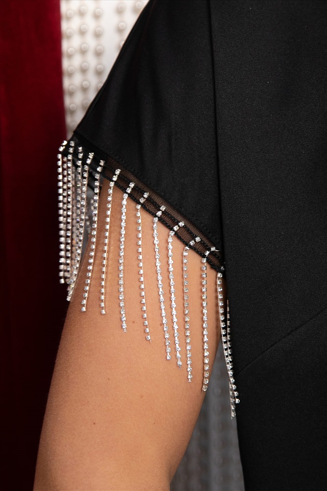 Декоративные элементы : бахрома из страз по плечу и на поясе