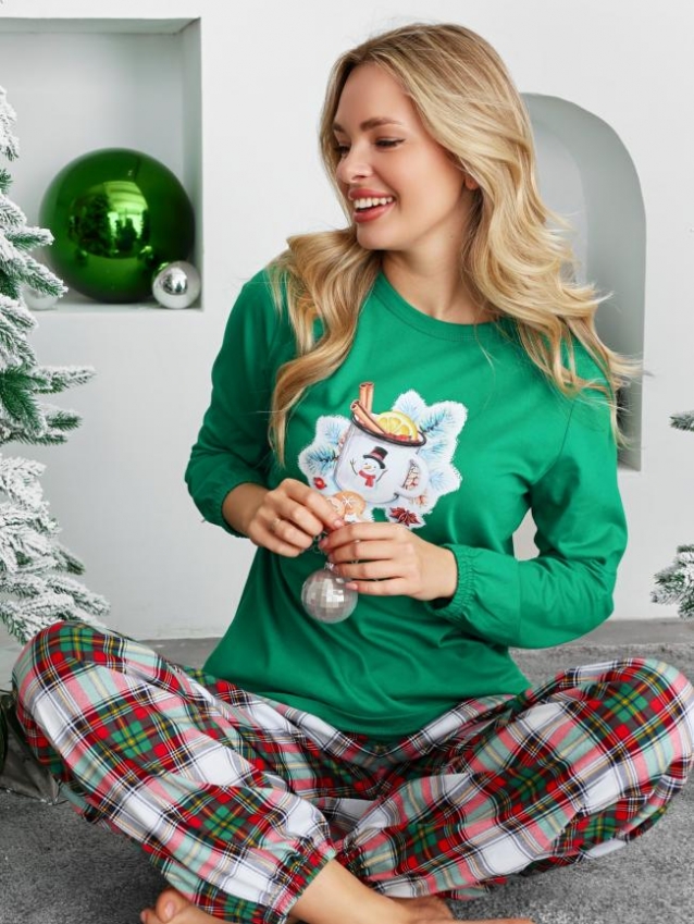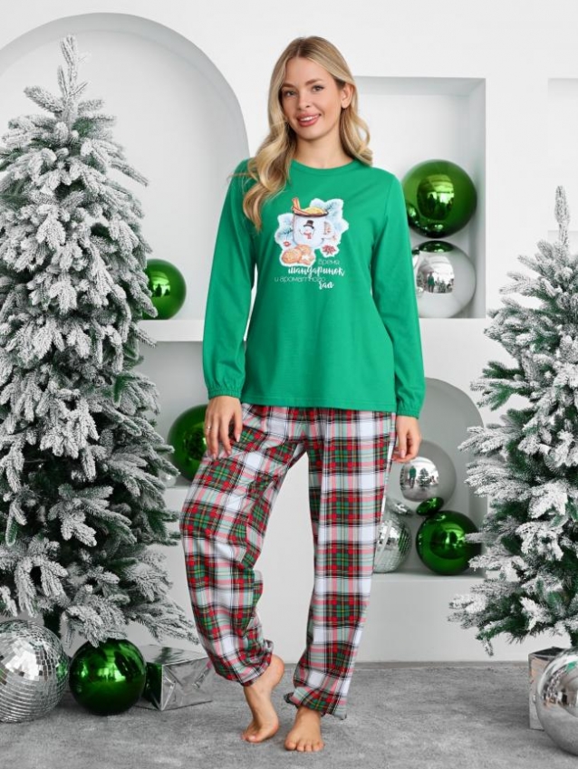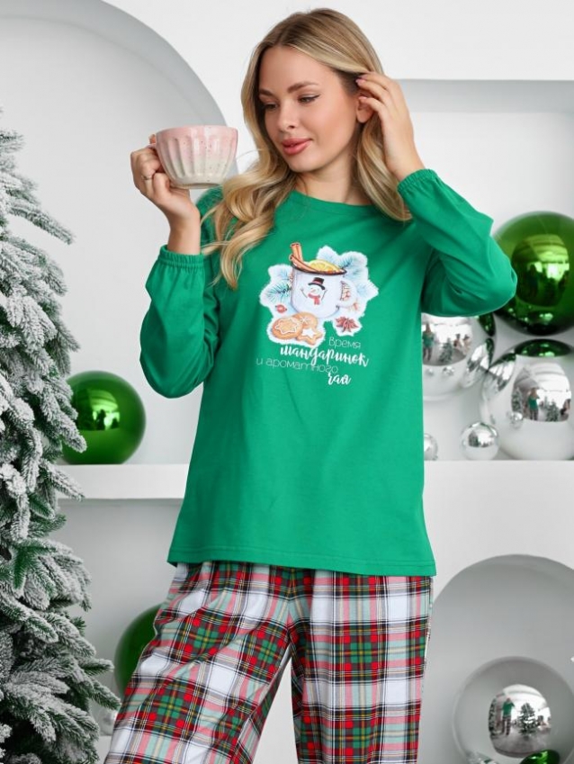 Костюм молодежный из трикотажного полотна «кулирка» в комбинации двух видов: с набивным рисунком и гладкокрашенного в единой цветовой гамме, состоящий из лонгслива и брюк. Лонгслив - из гладкокрашенного полотна, классического покроя, с длинными втачными рукавами по нижнему срезу с эластичной тесьмой, горловиной овальной формы и принтом на полочке, выполненным в технике «шелкографии». Горловина окантована основным материалом.Брюки - из полотна с набивным рисунком, длинные, с карманами в боковых швах. Притачной пояс и низ брюк с эластичной тесьмой. Комментарии к товару