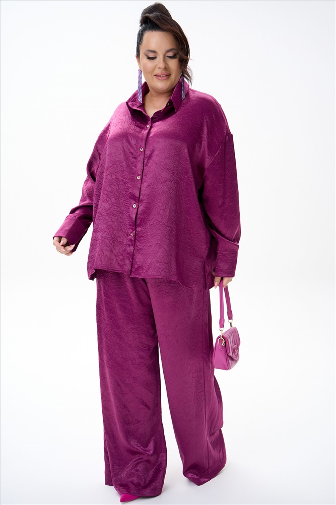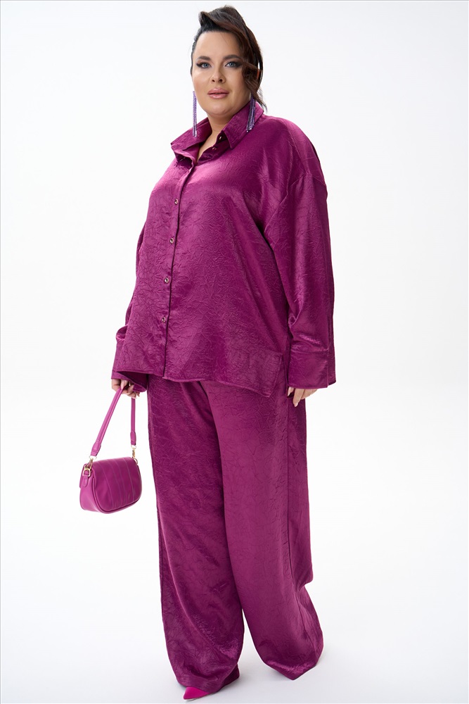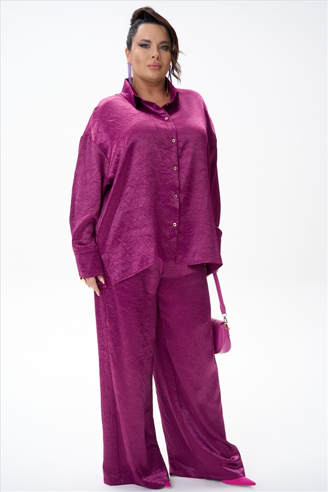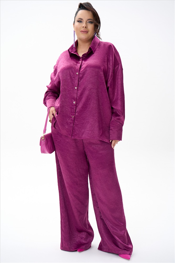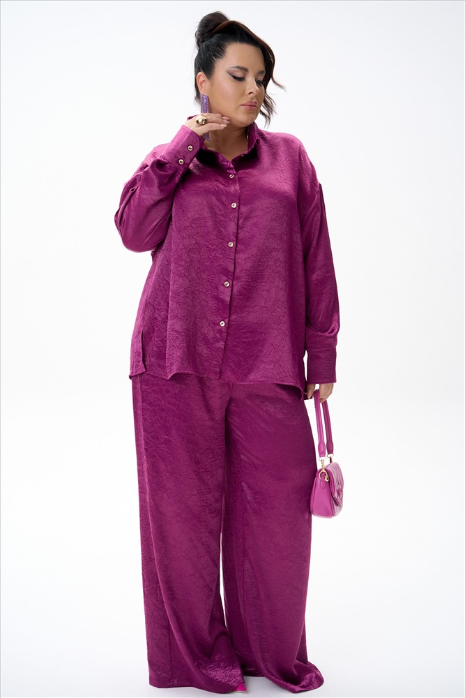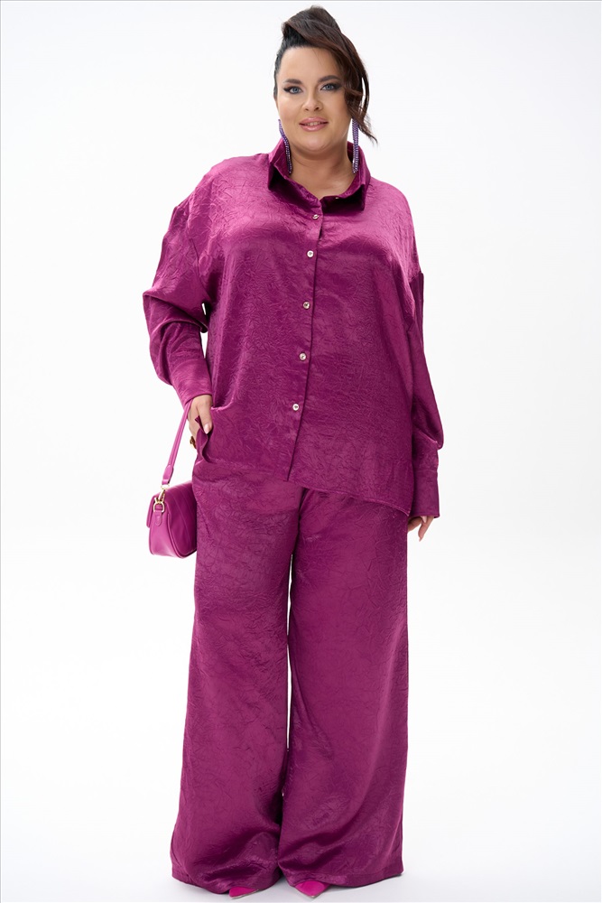 Рубашка свободного кроя и широкие брюки создают ощущение лёгкости и комфорта, при этом силуэт остаётся элегантным.