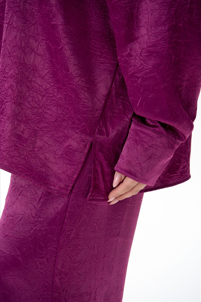 Мягкий блеск ткани добавляет образу утончённости, а «мятая» фактура — характер и динамику.