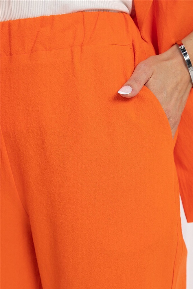 Артикул: К13076-4М. Тип ткани: натуральный. Состав: 85% хлопок, 15% лён. Материал: костюмный. Цвет: оранжевый. Принт: отсутствует. Вид застежки: без застёжки. Карманы: есть. Резинка в поясе: есть. Силуэт: полуприлегающий. Декоративные элементы: пояс из основной ткани на двух полукольцах в комплекте. Длина верха по спинке от верхней точки плеча: 46/ 67 см, 48/ 68 см, 50/ 69 см, 52/ 70 см, 54/ 71 см, 56/ 72 см. Длина брюк по боковому шву: 46-56/ 103 см. Размер изделия на модели: 44 Рост модели: 168 см.