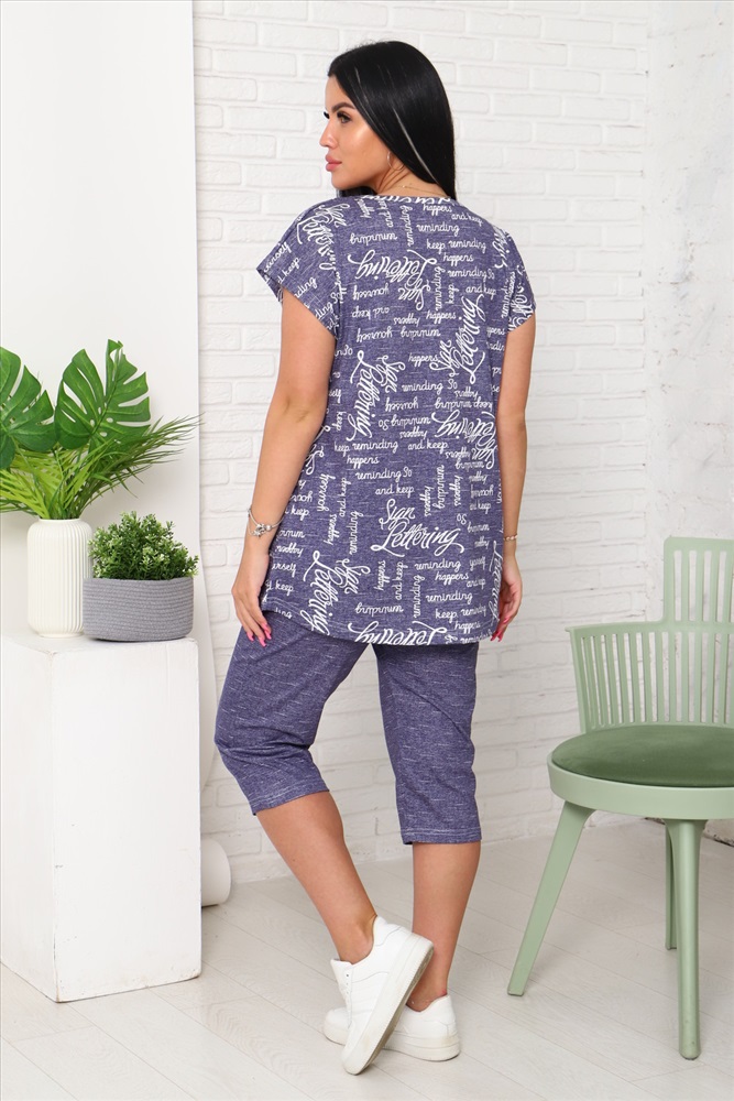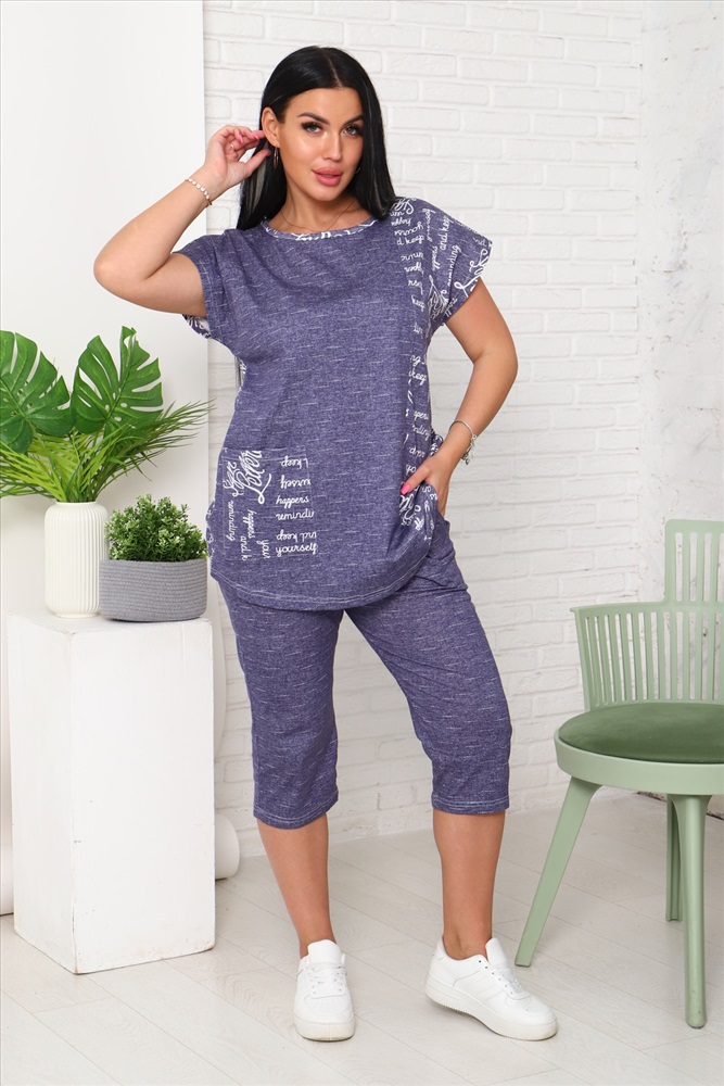 Костюм женский футболка и бриджи. Футболка со спущенным плечом и накладным карманом, низ футболки фигурный. Бриджи с карманами.